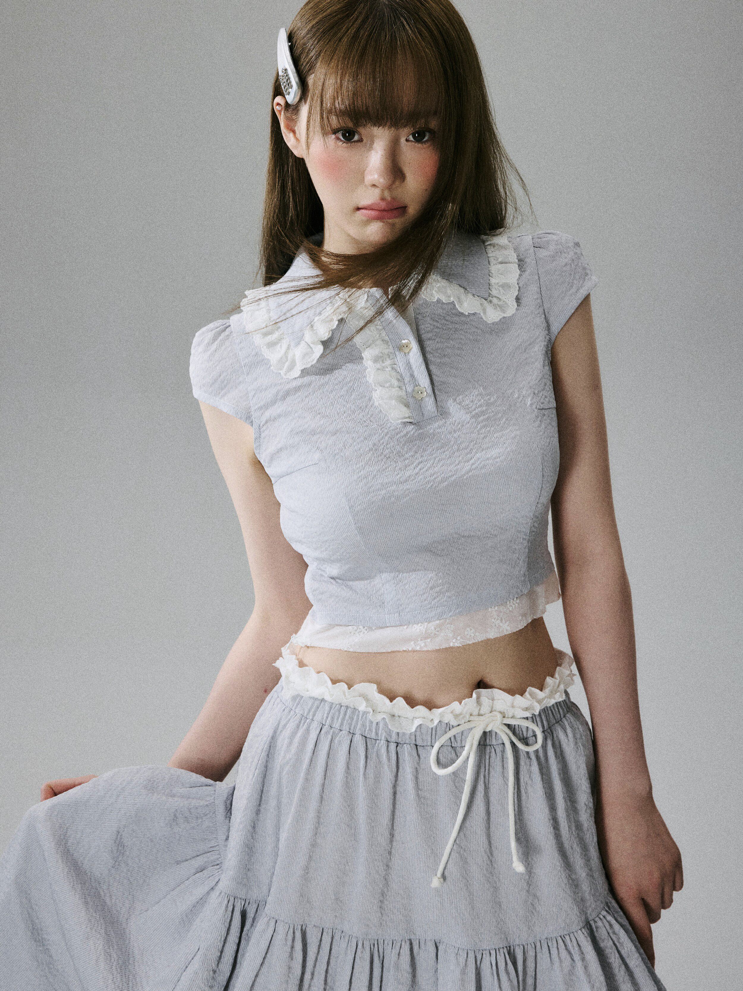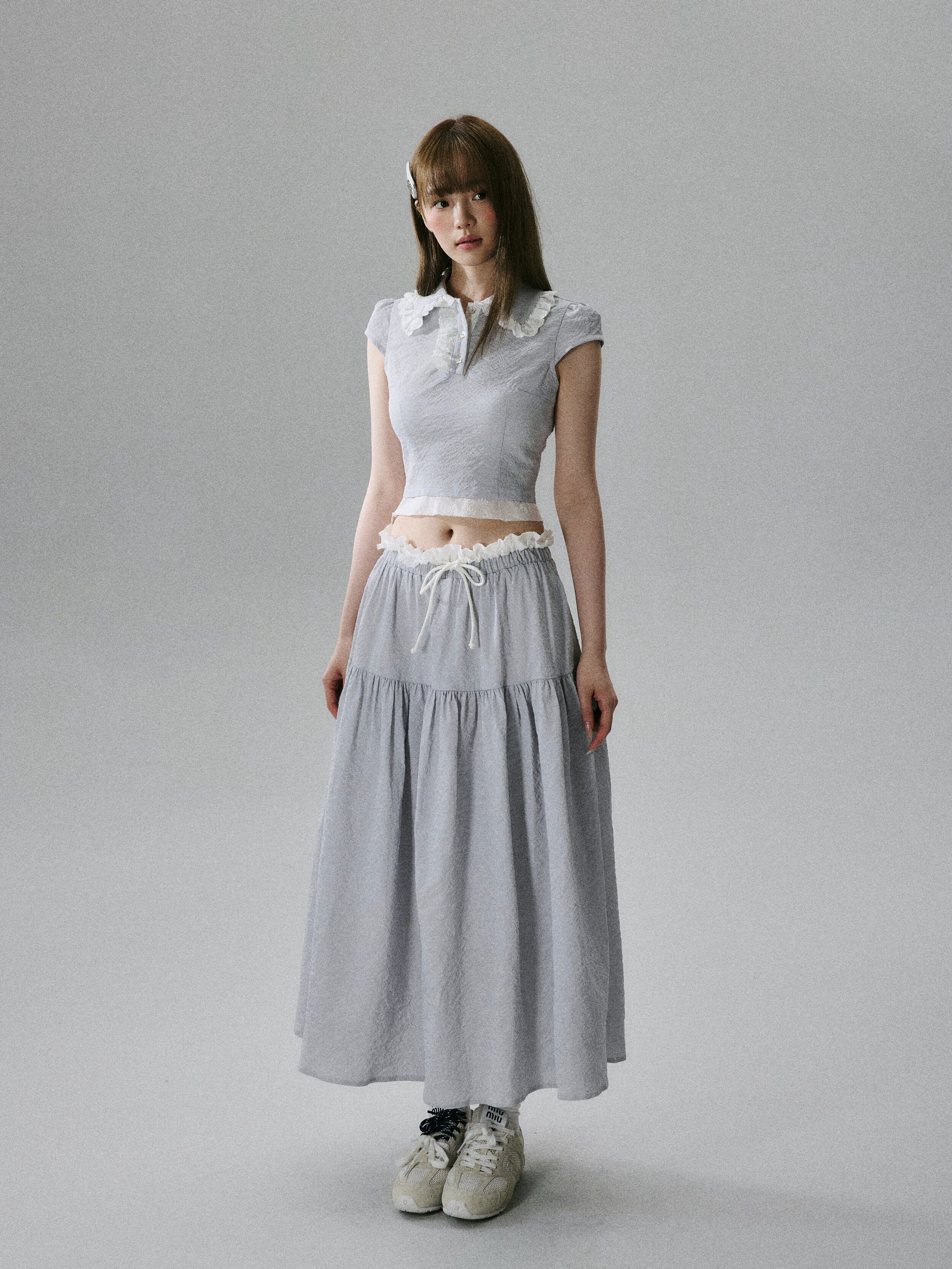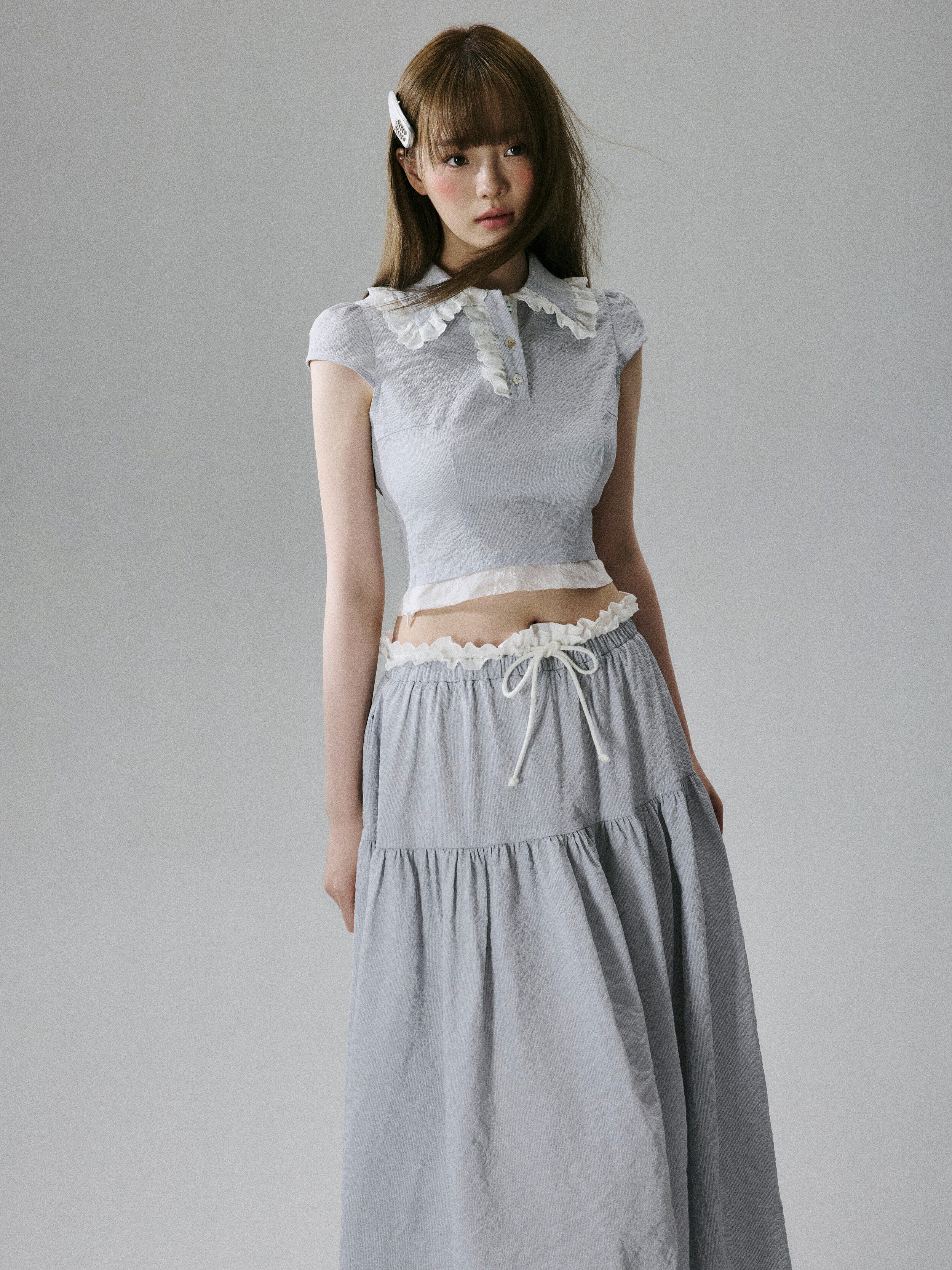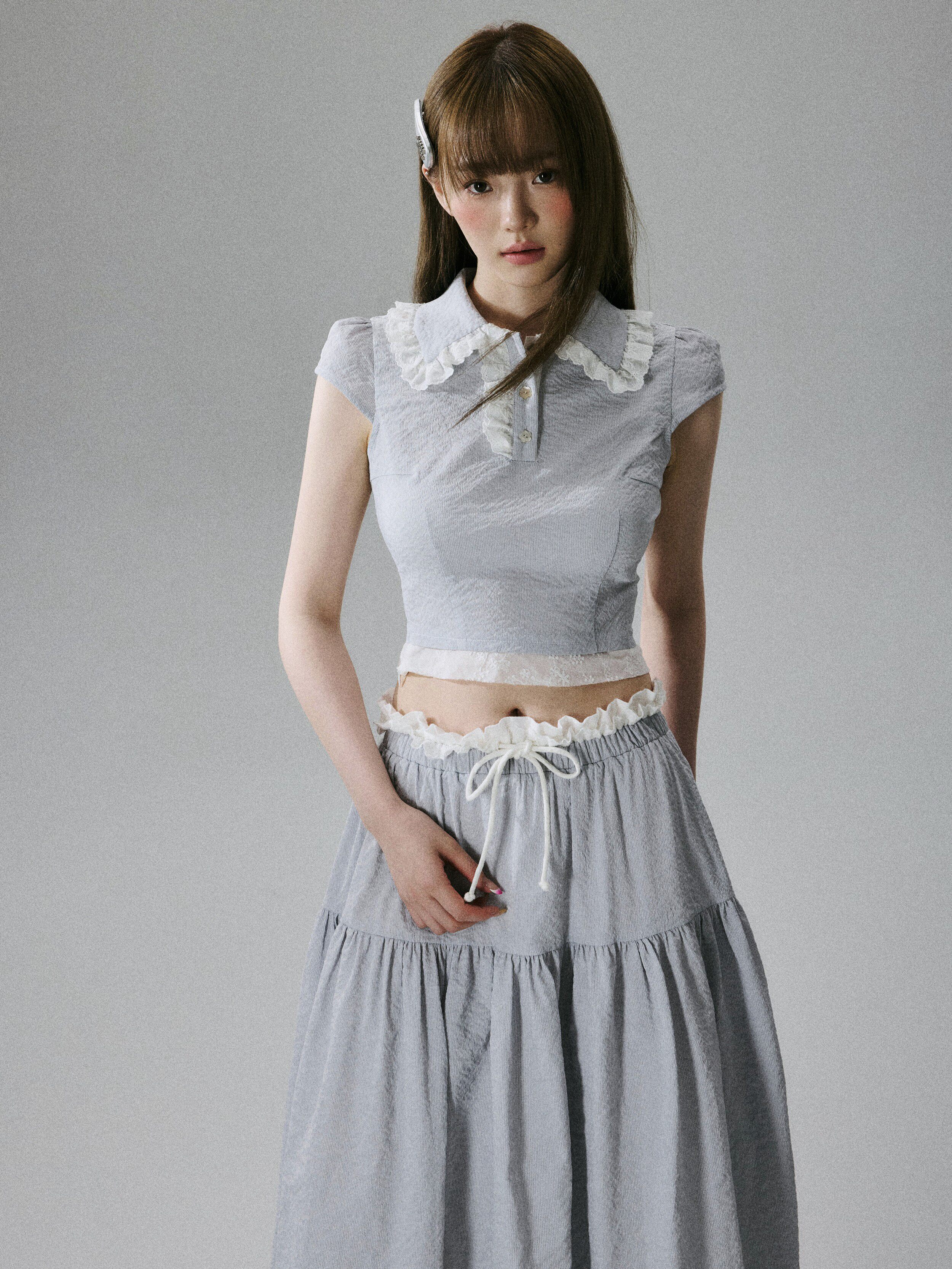 Lace-Trim Short Sleeve Shirt & Drawstring Skirt Setup NA8856