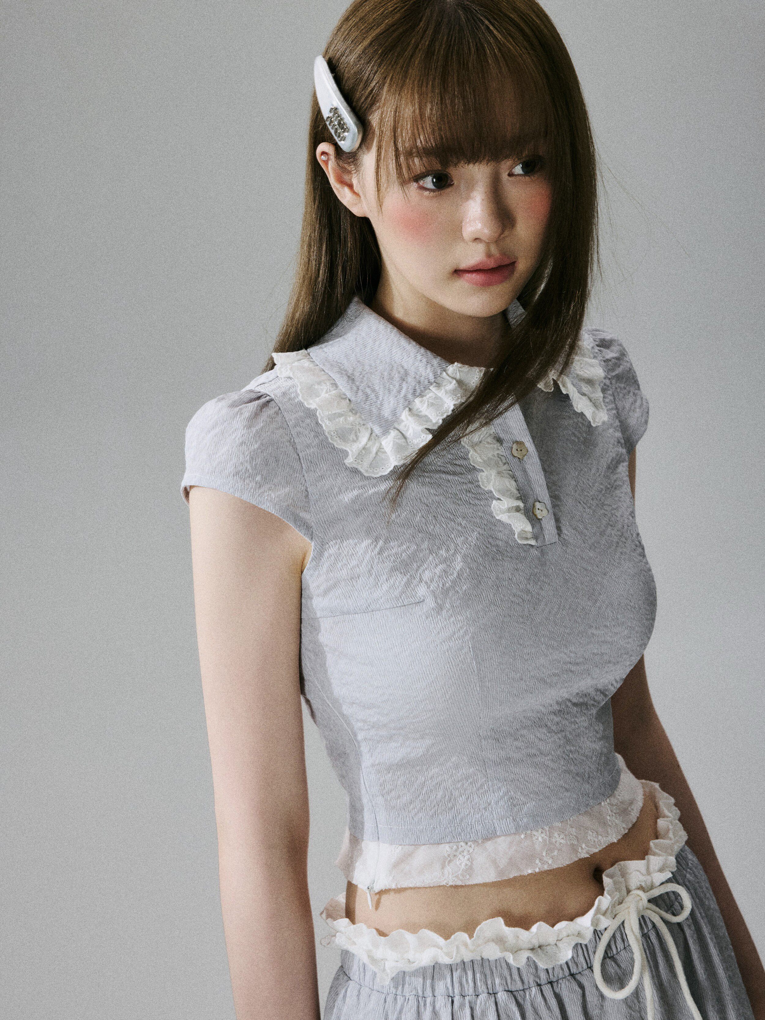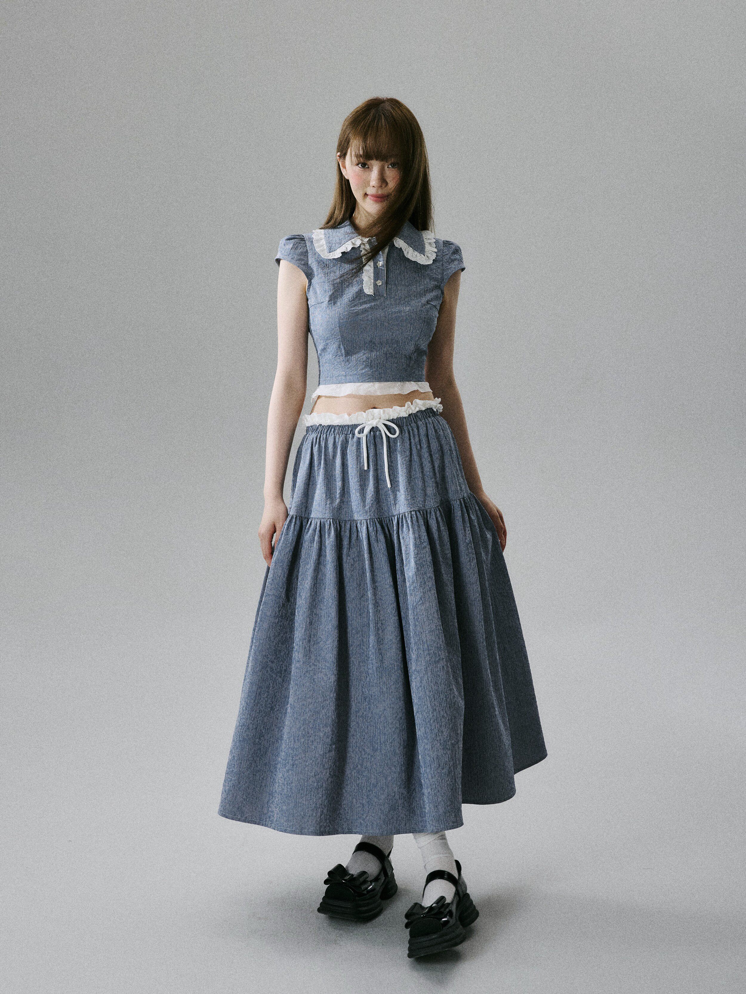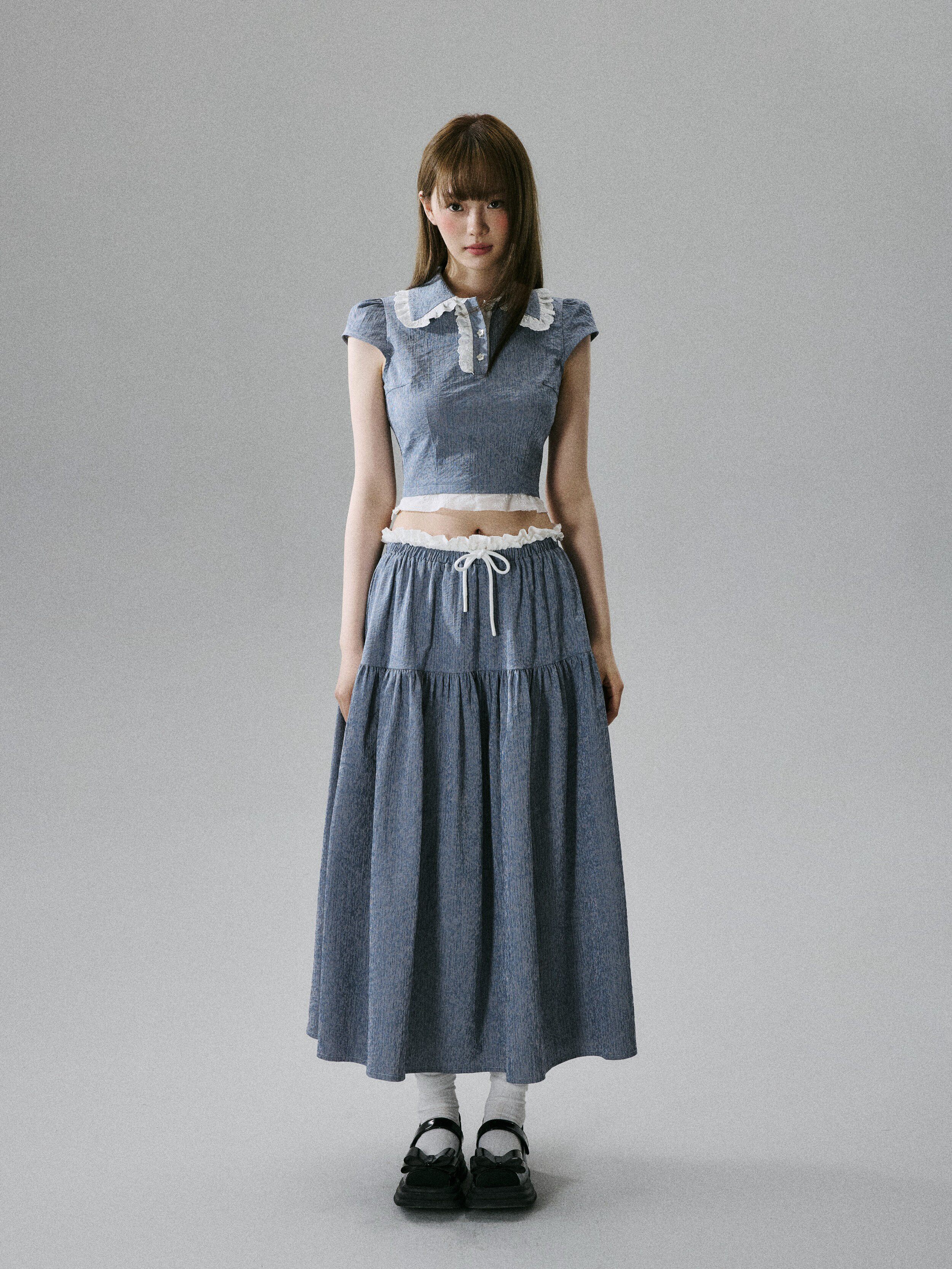 Lace-Trim Short Sleeve Shirt & Drawstring Skirt Setup NA8856