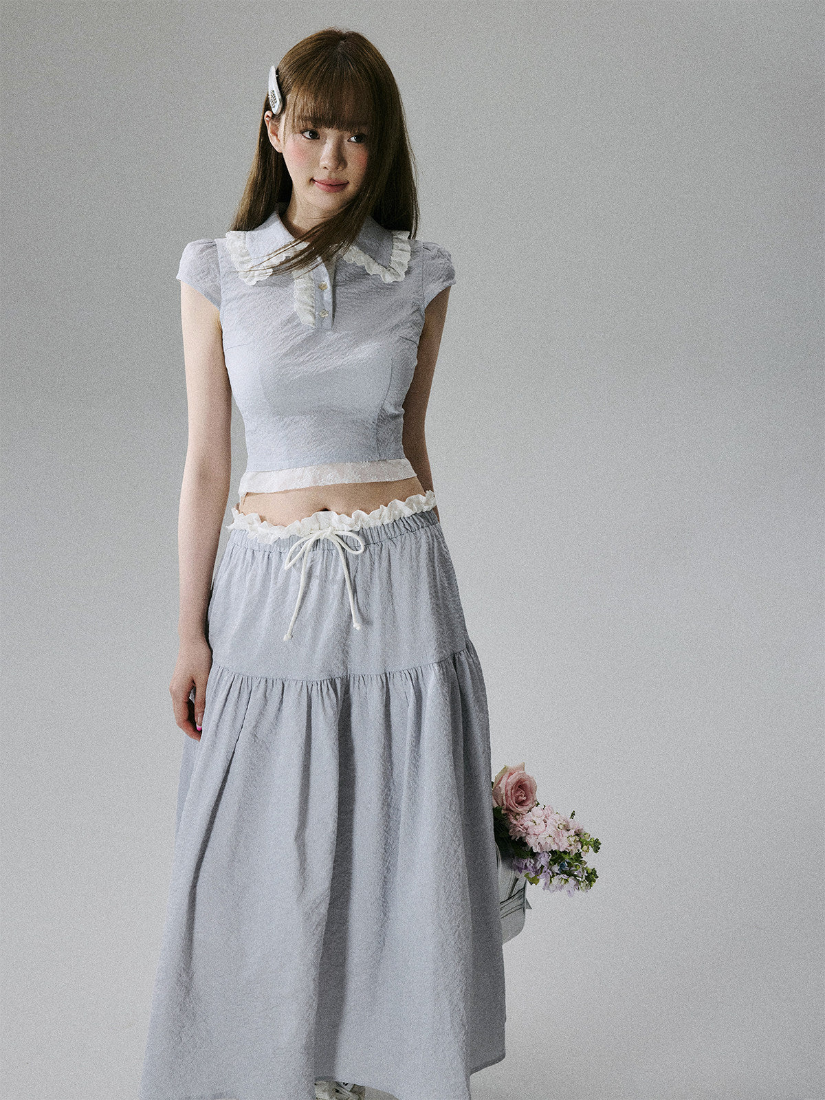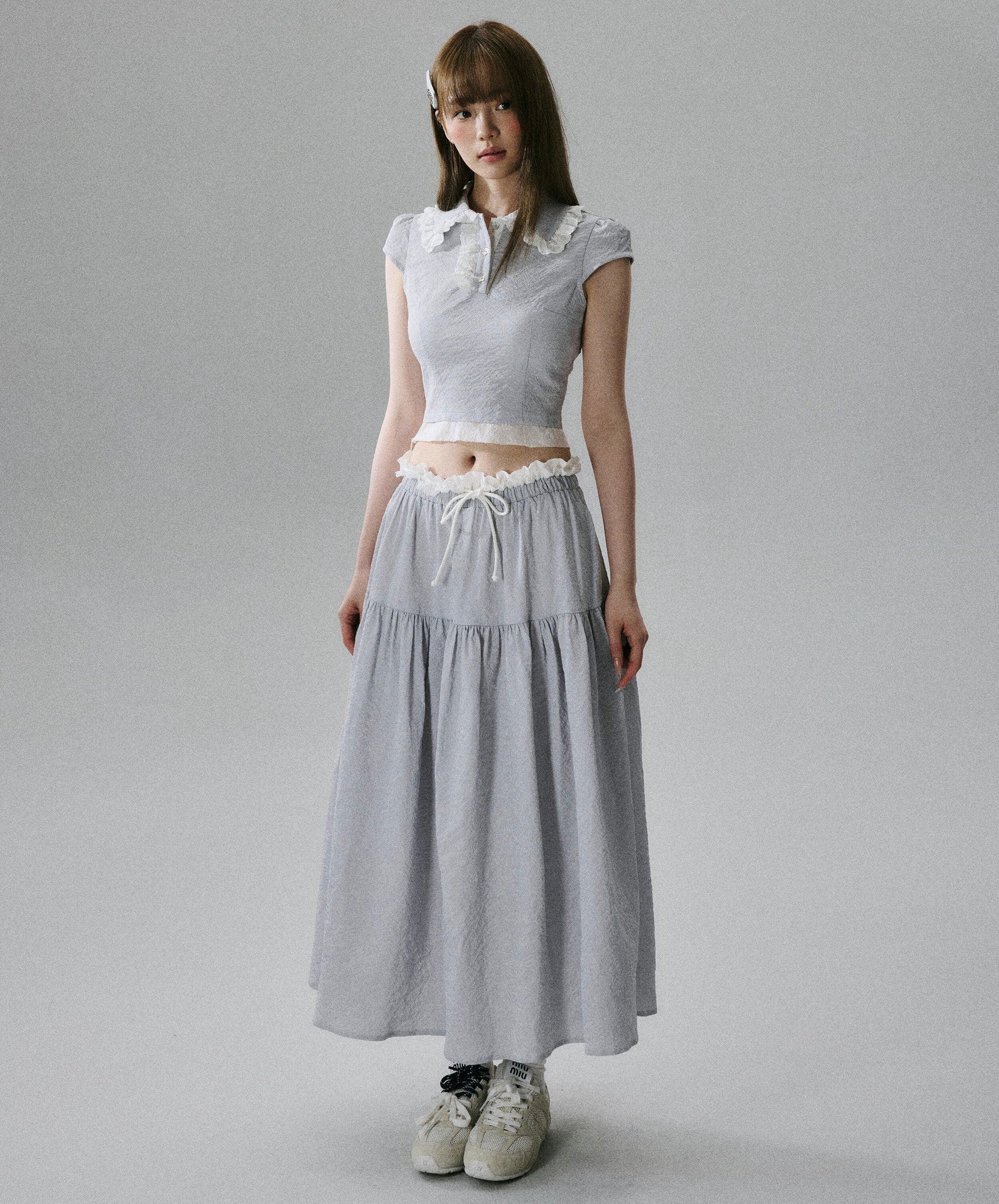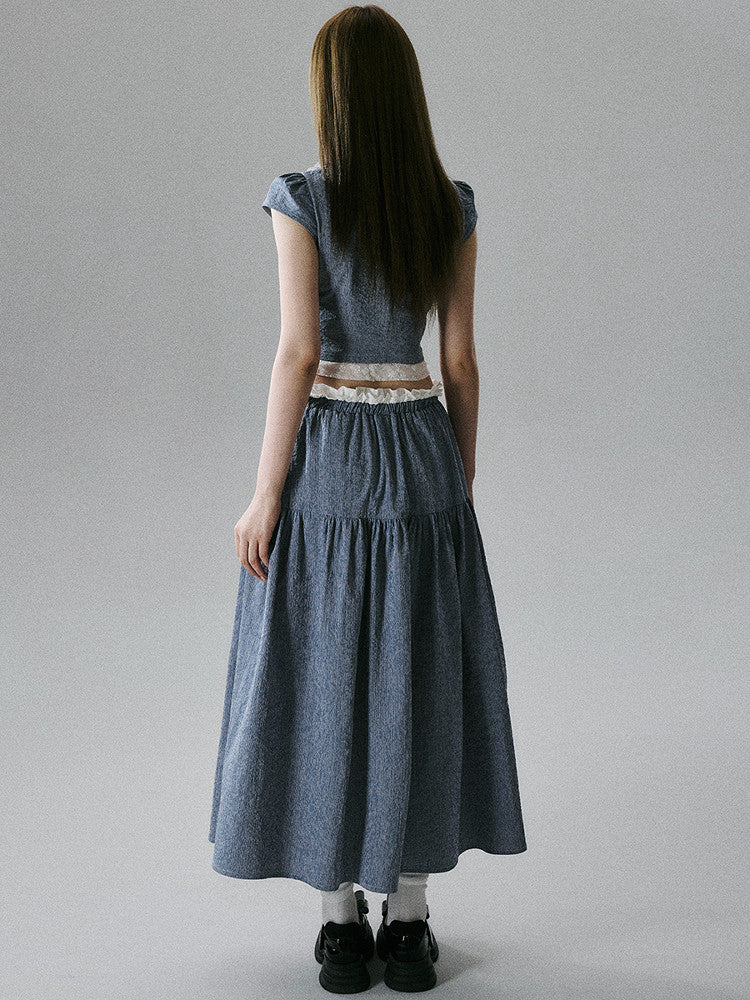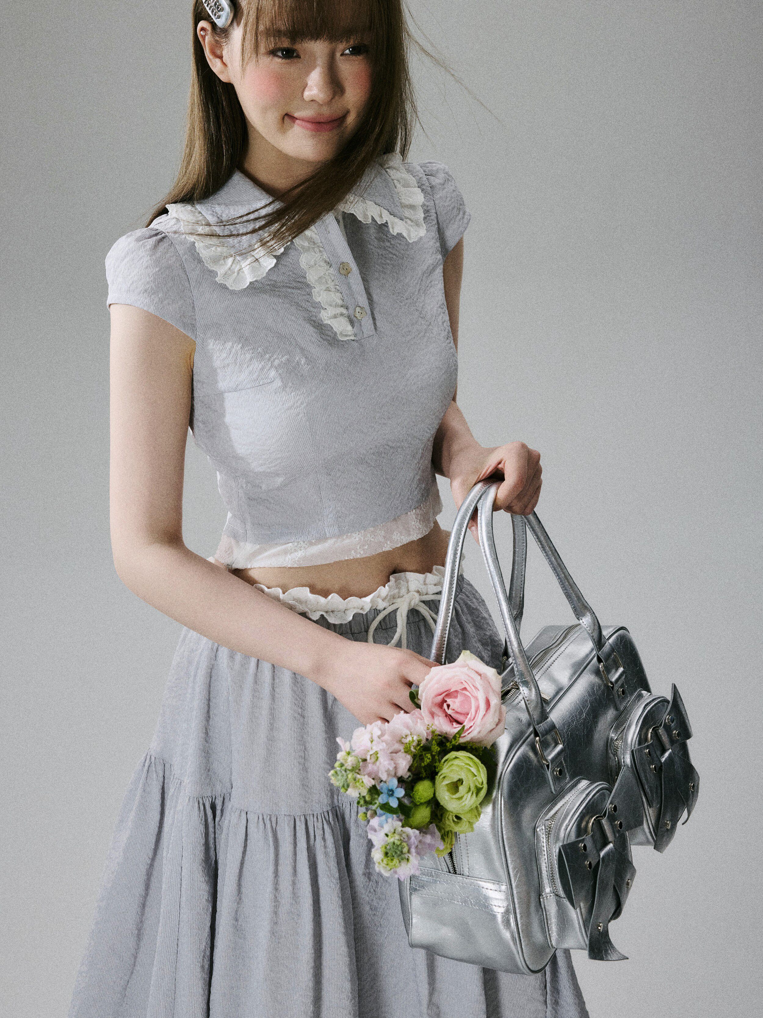Lace-Trim Short Sleeve Shirt & Drawstring Skirt Setup NA8856
