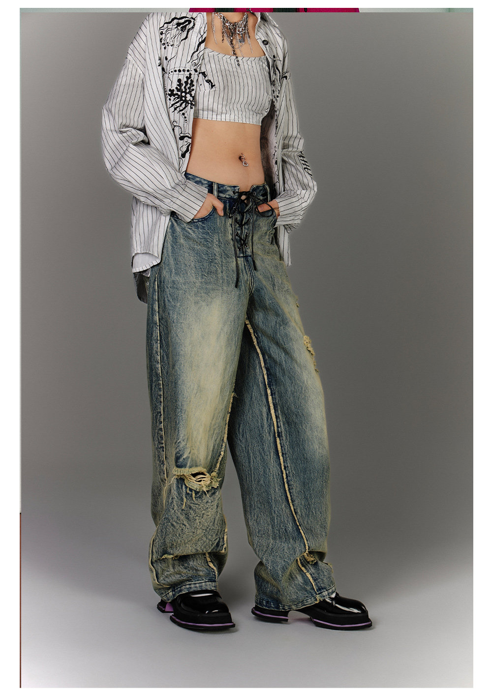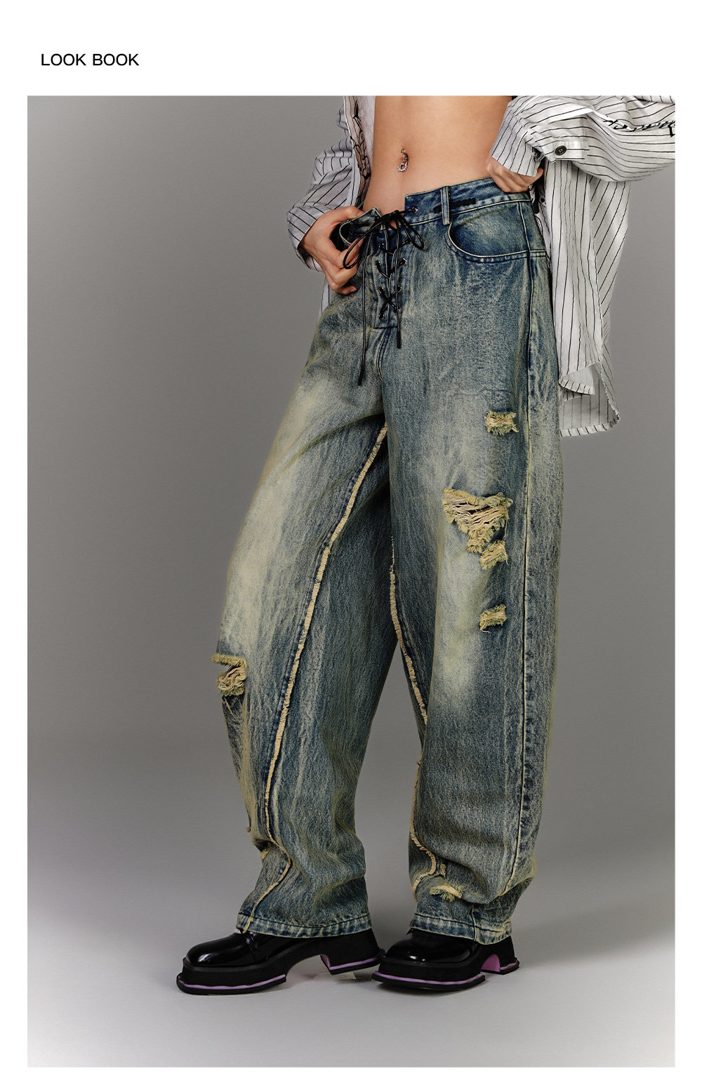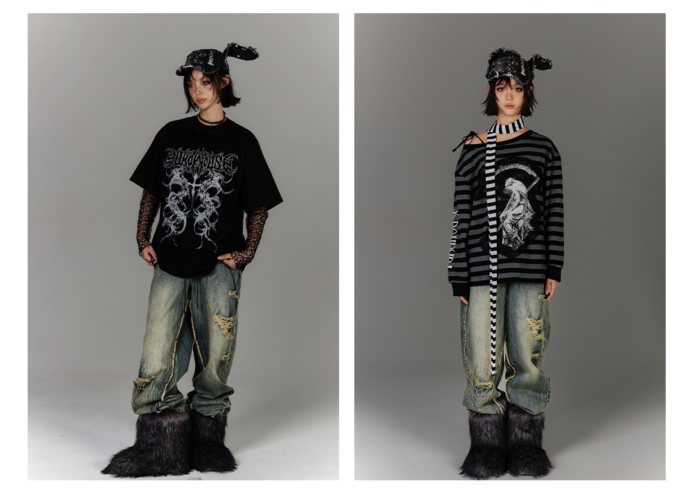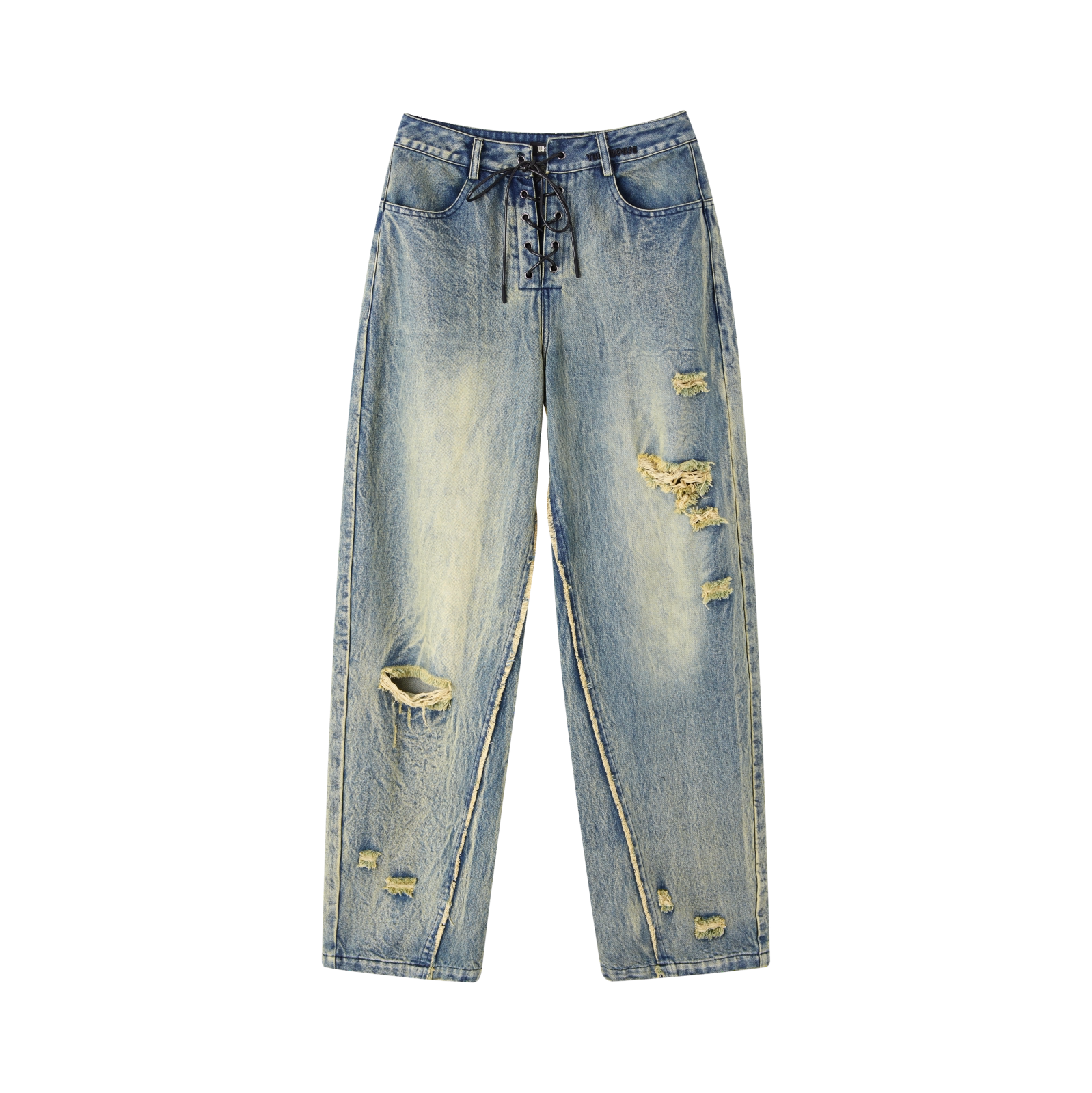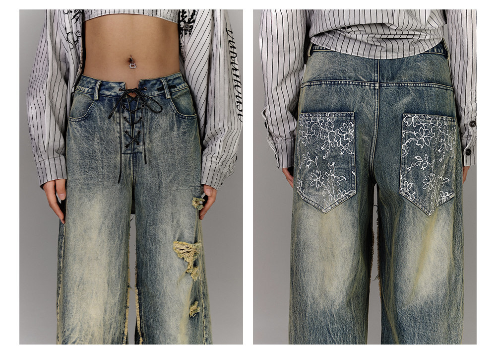 Washed Blue Damage Wide Leg Denim Jeans NA8878