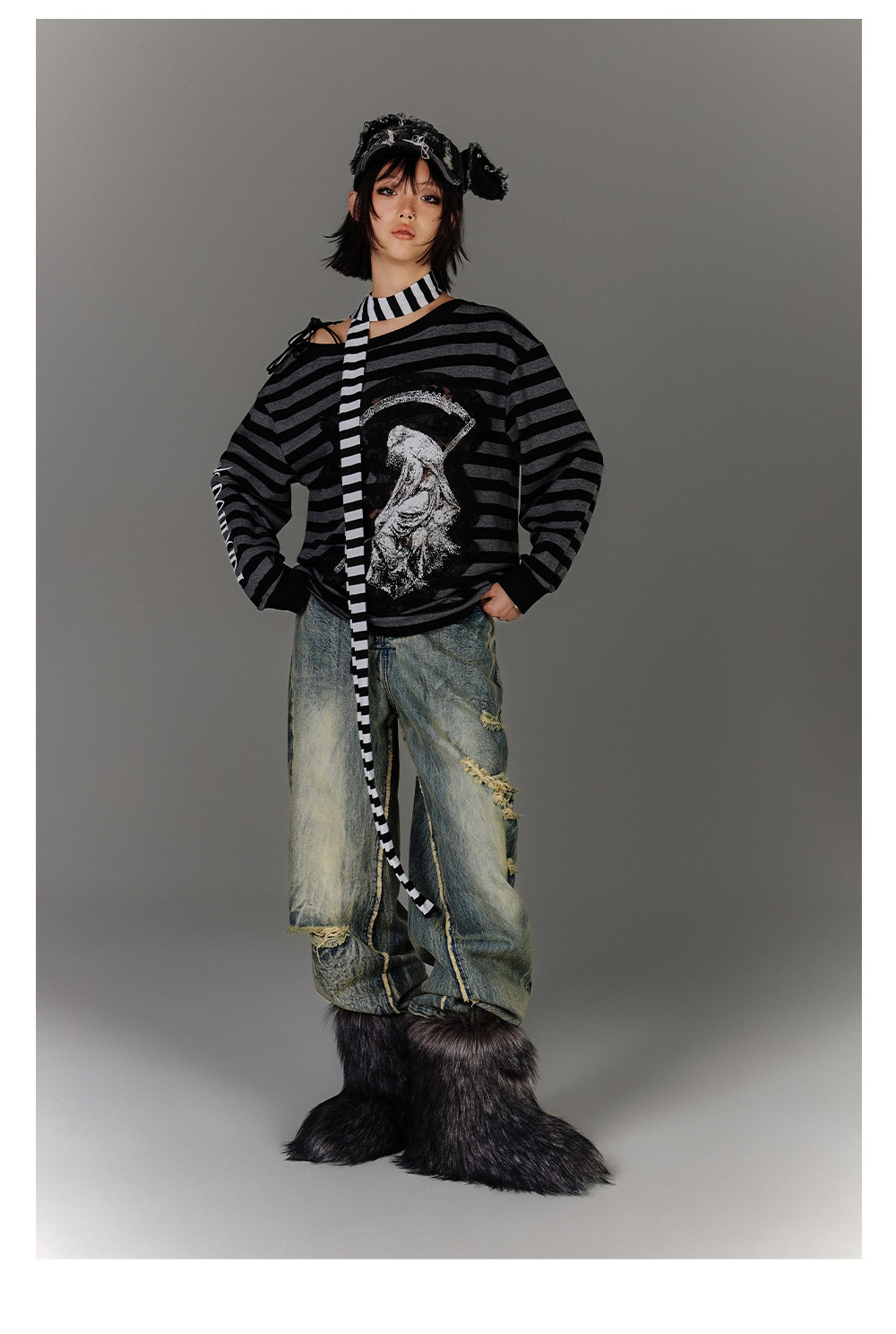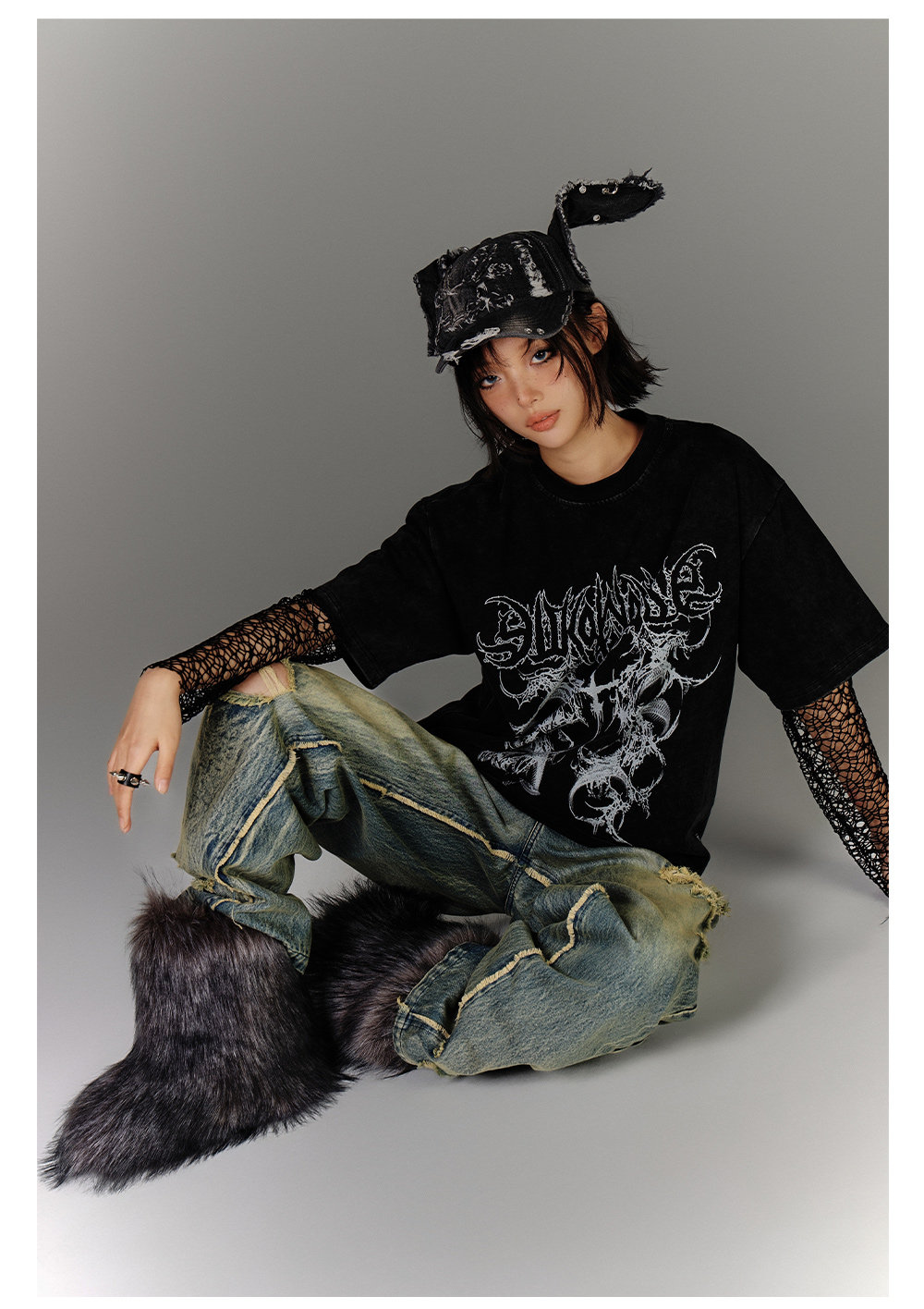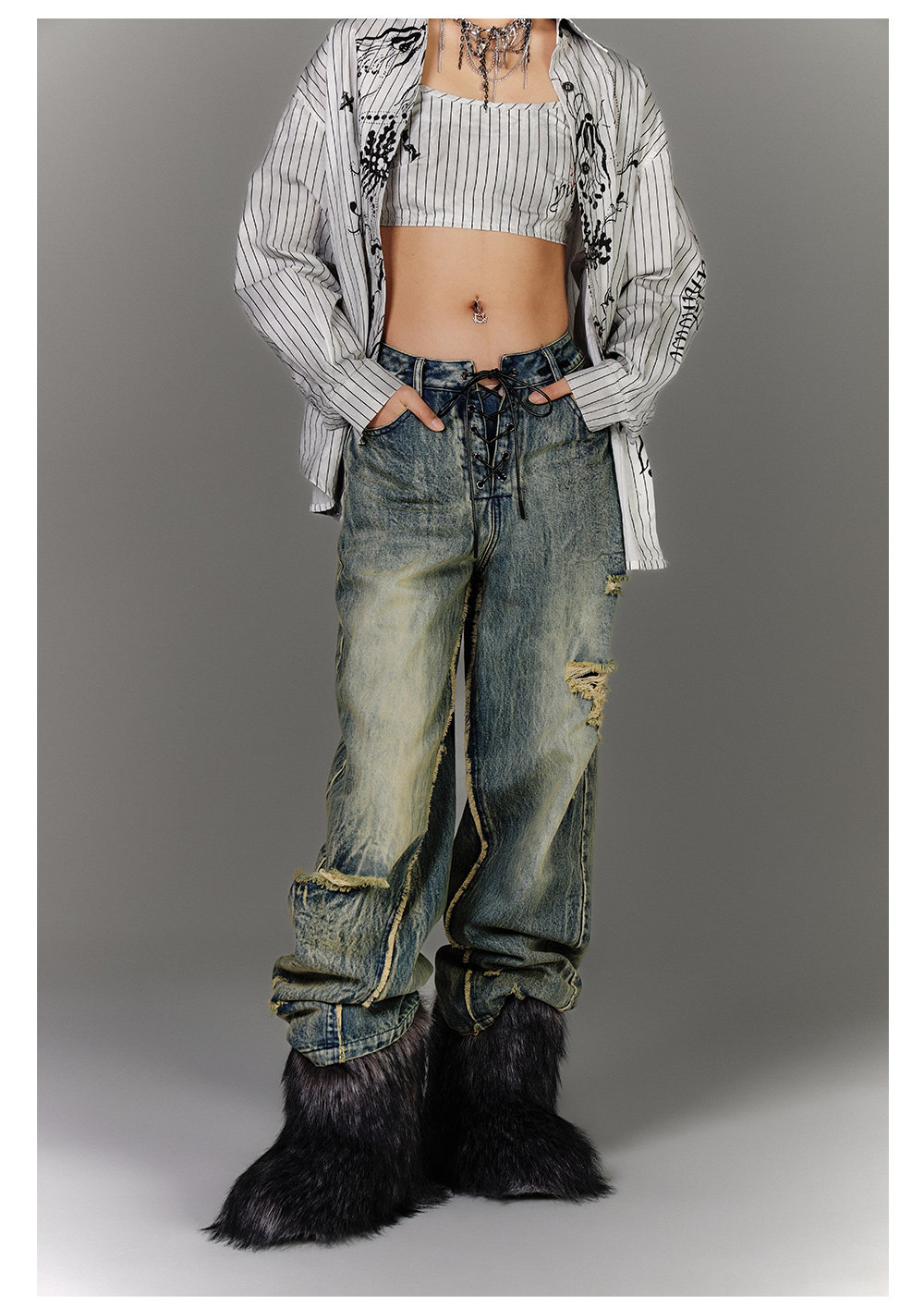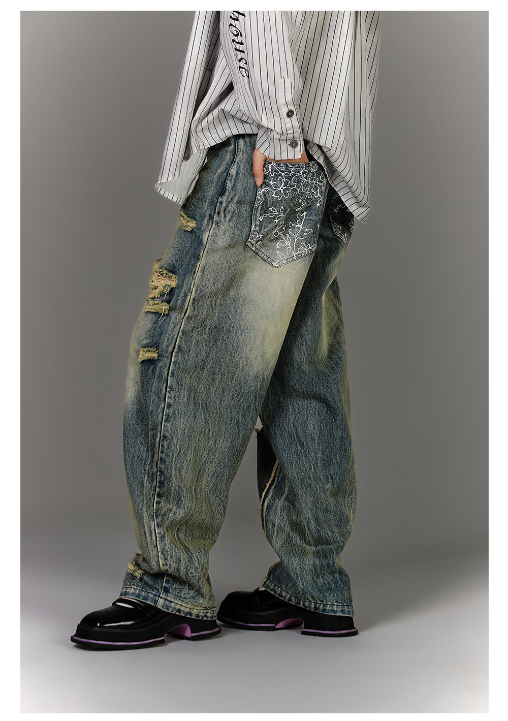 Washed Blue Damage Wide Leg Denim Jeans NA8878