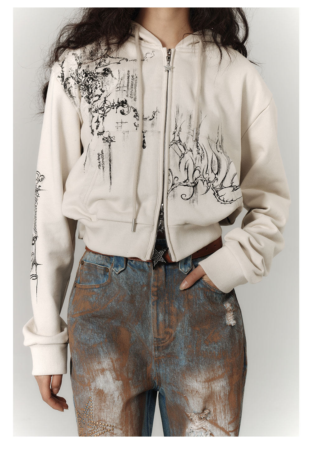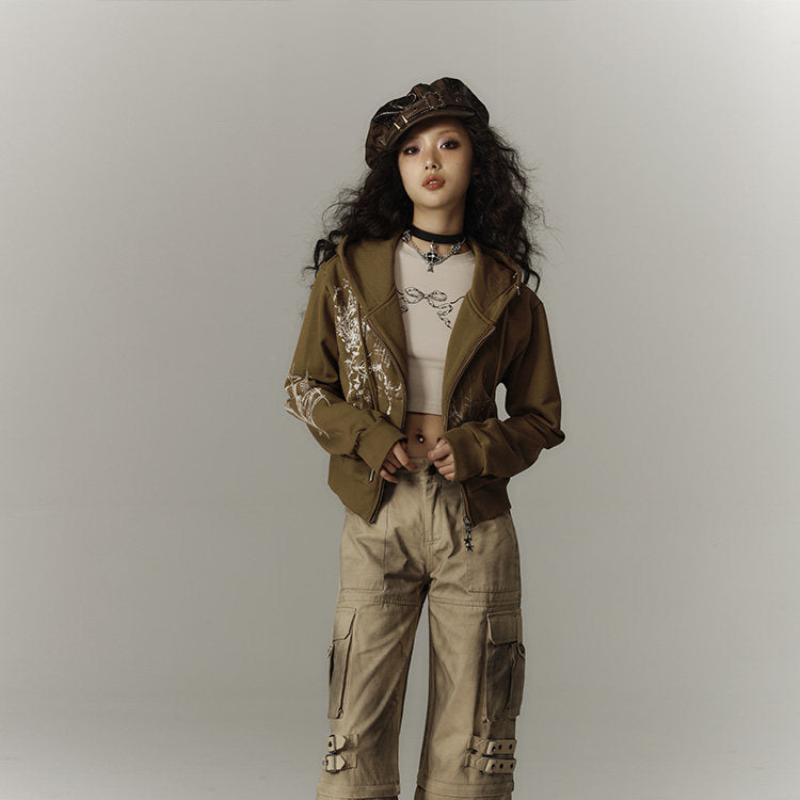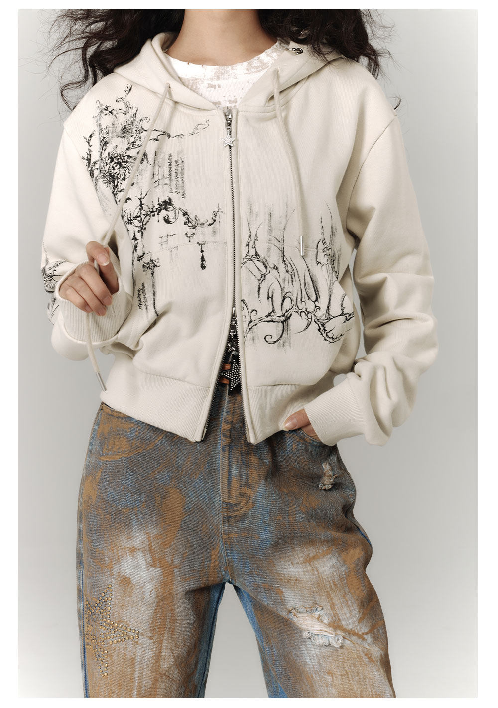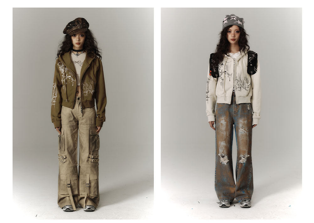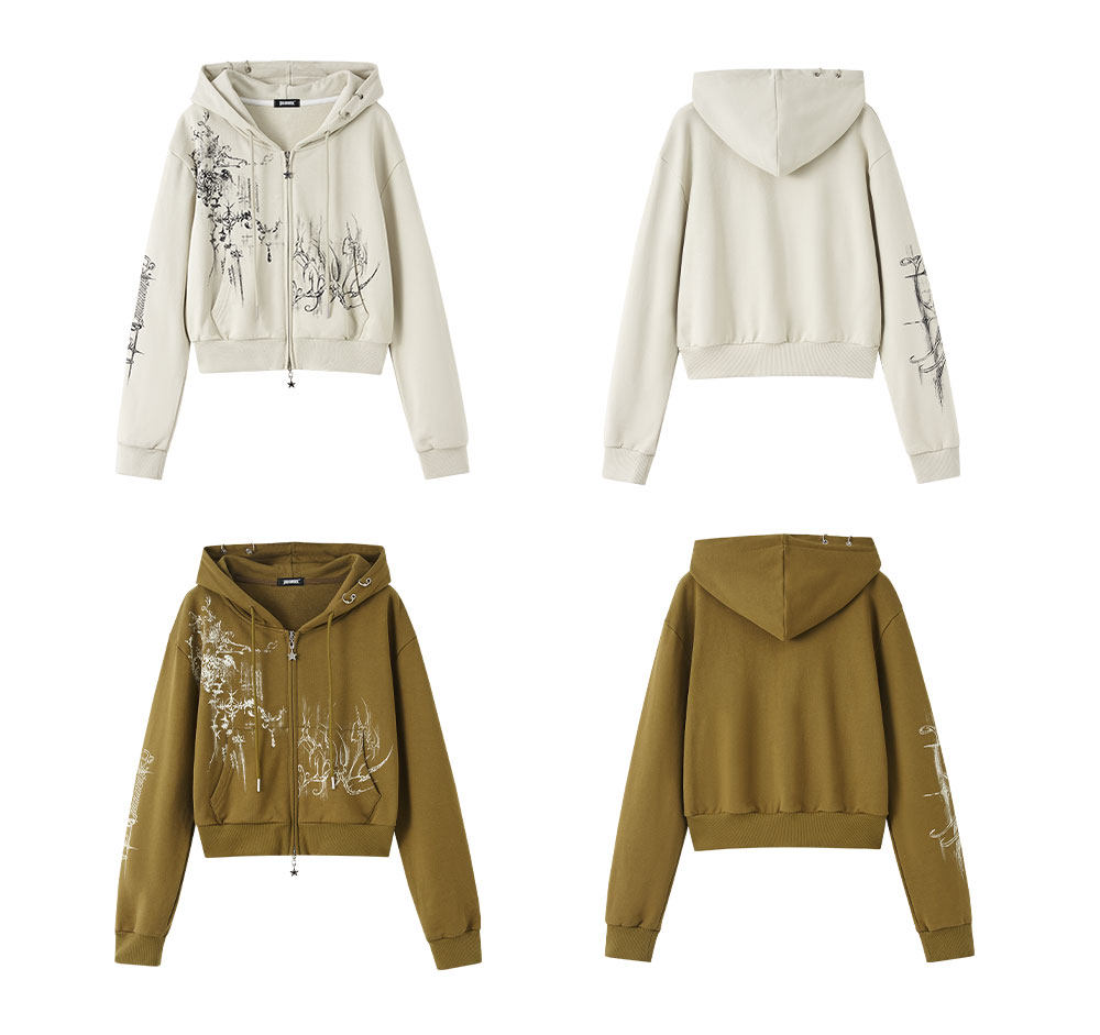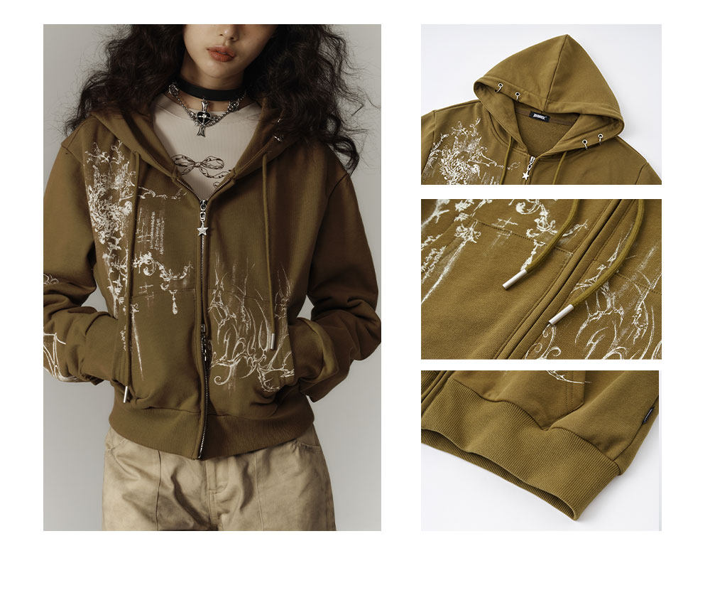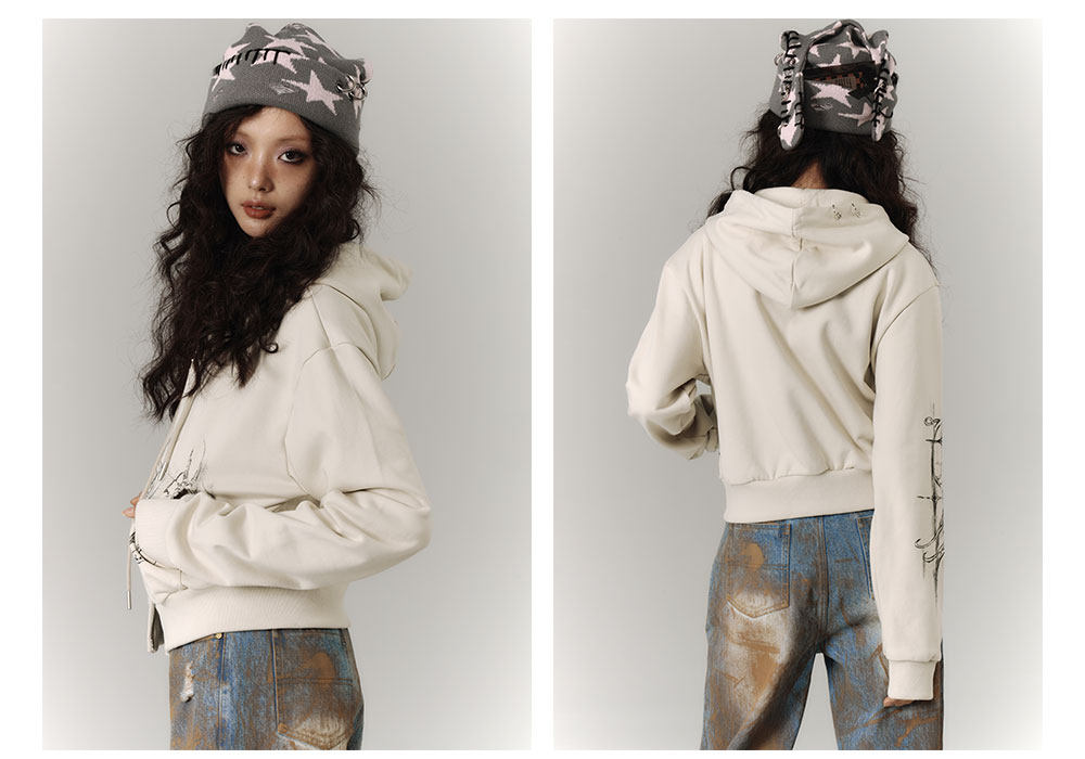 Cropped Graphic Print Zipper Hoodie NA8895