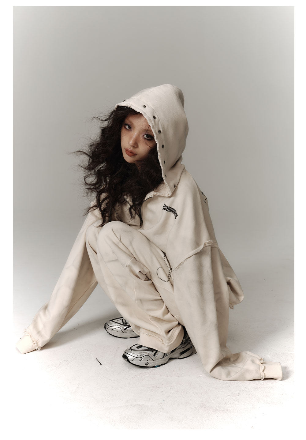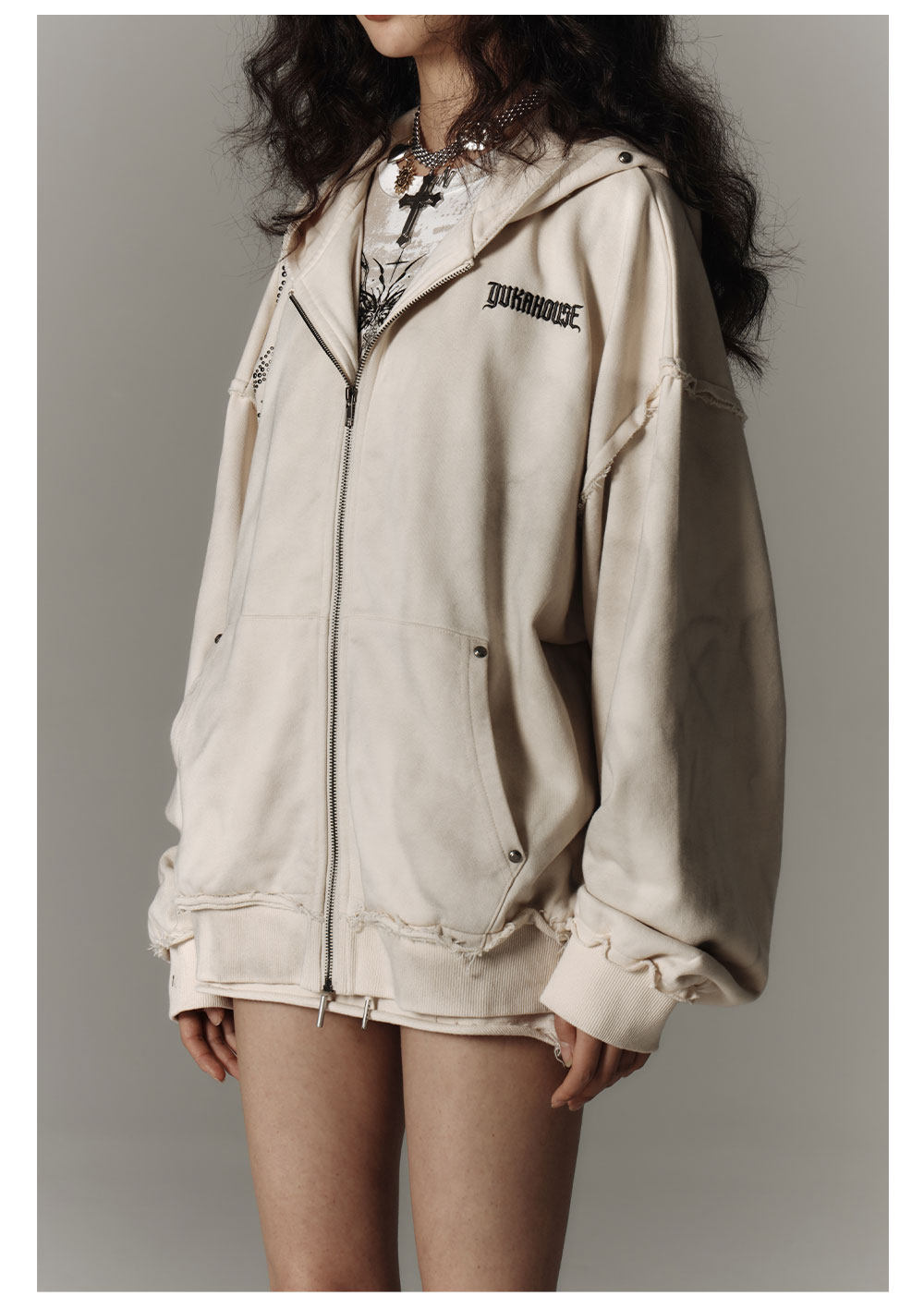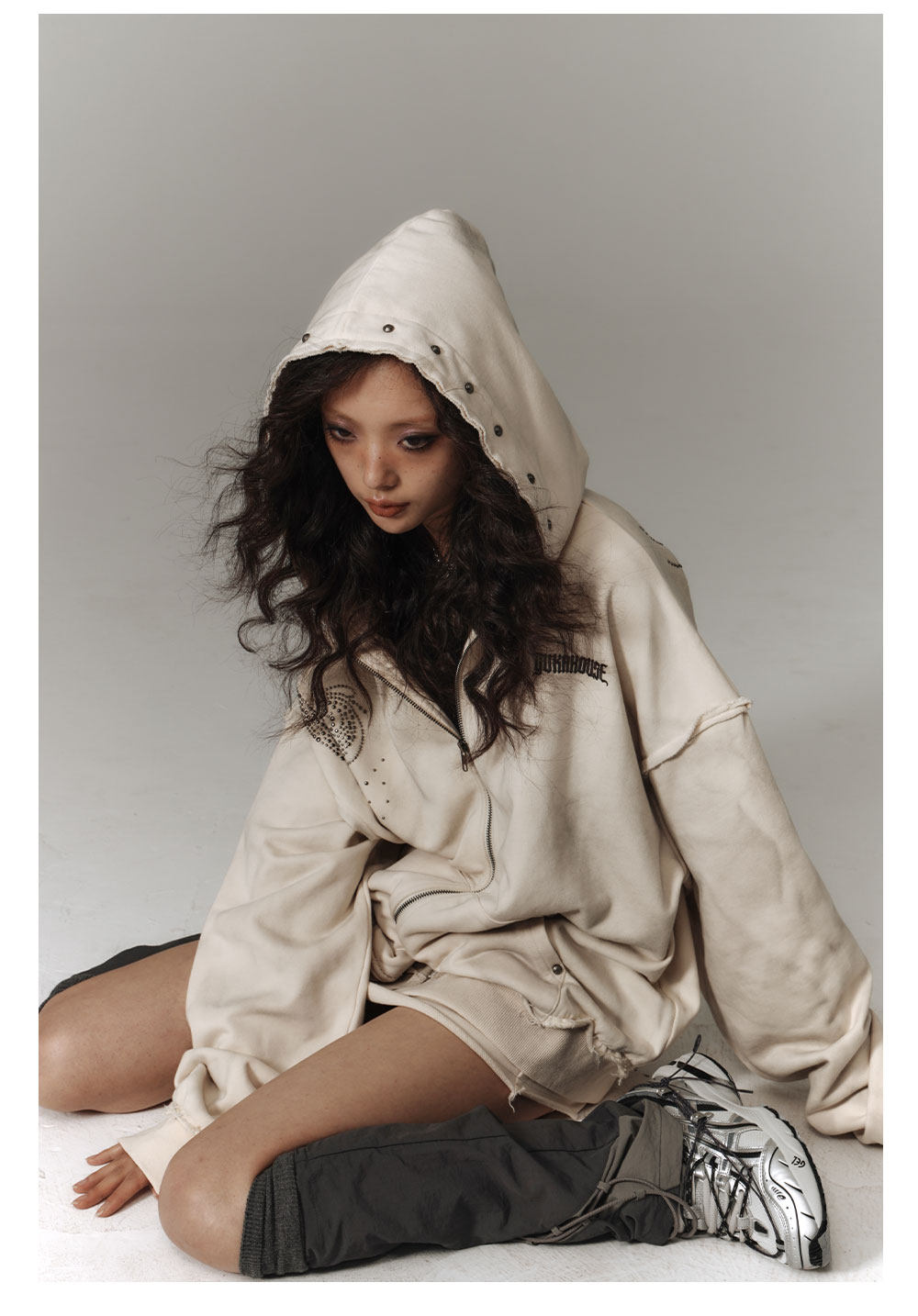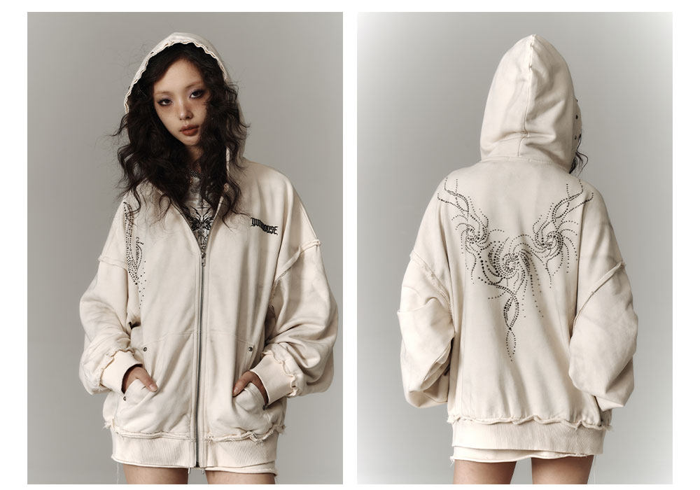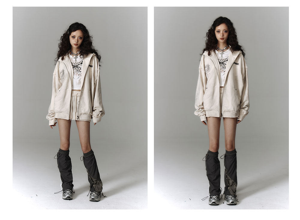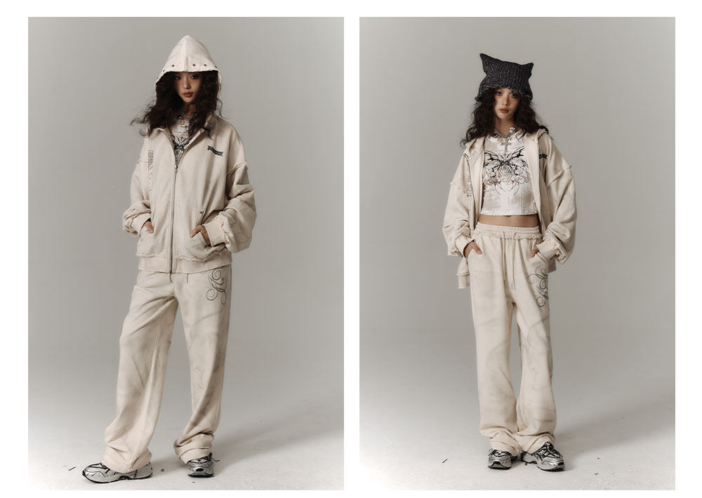 Washed Damage Oversize Zipper Hoodie & Short Skirt & Wide Leg Pants Setup NA8911