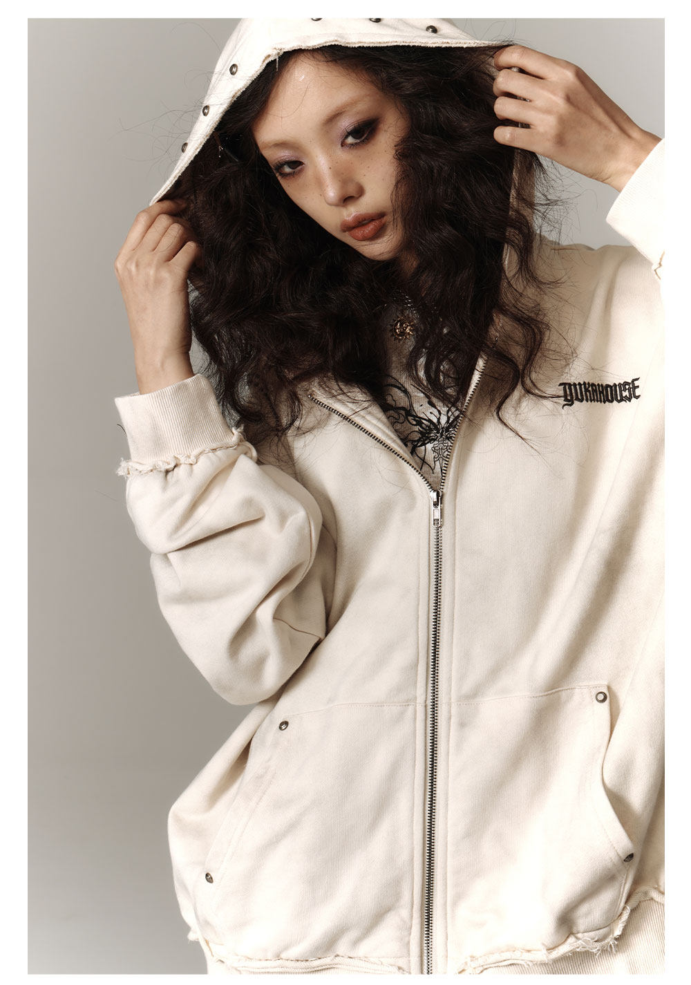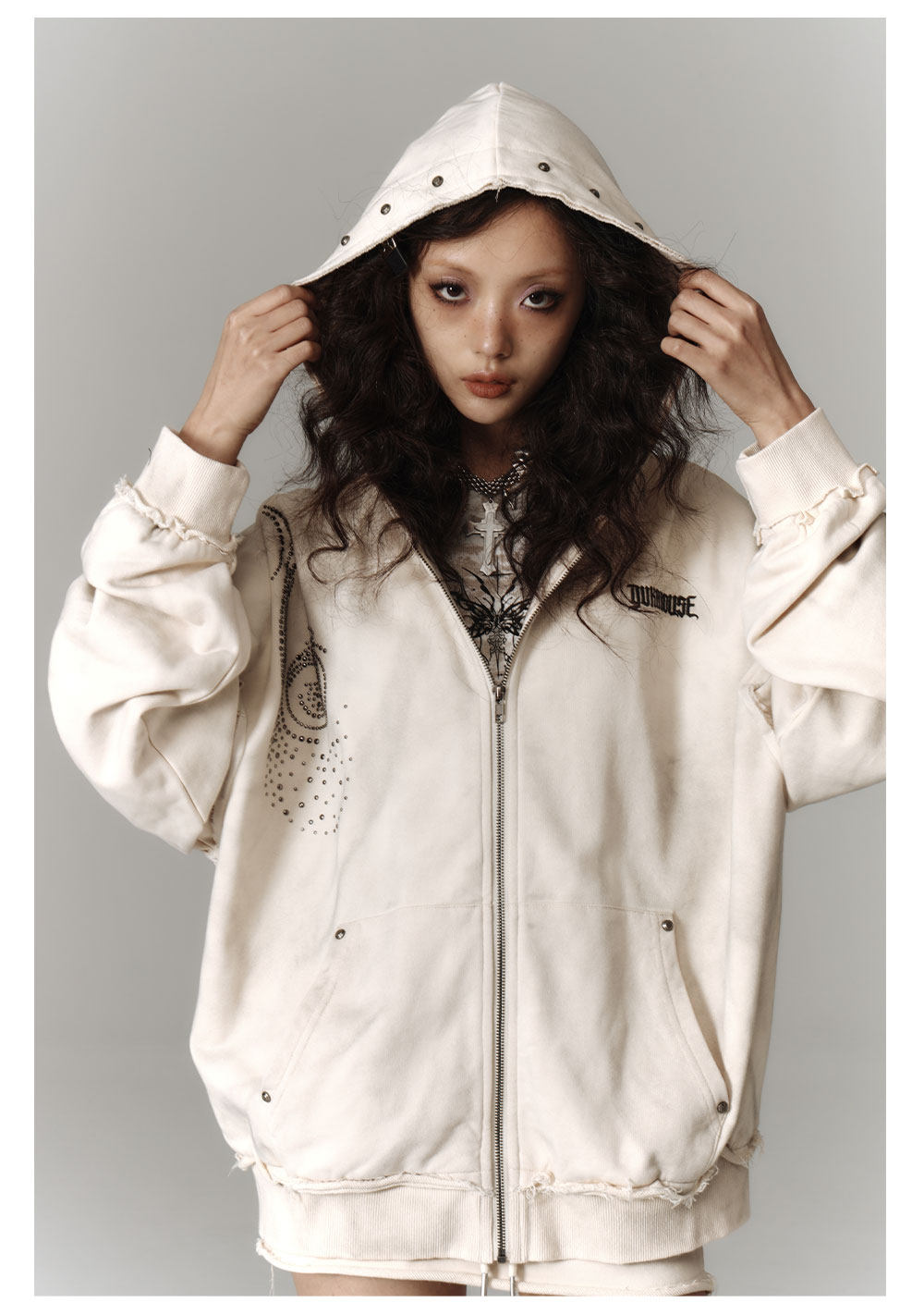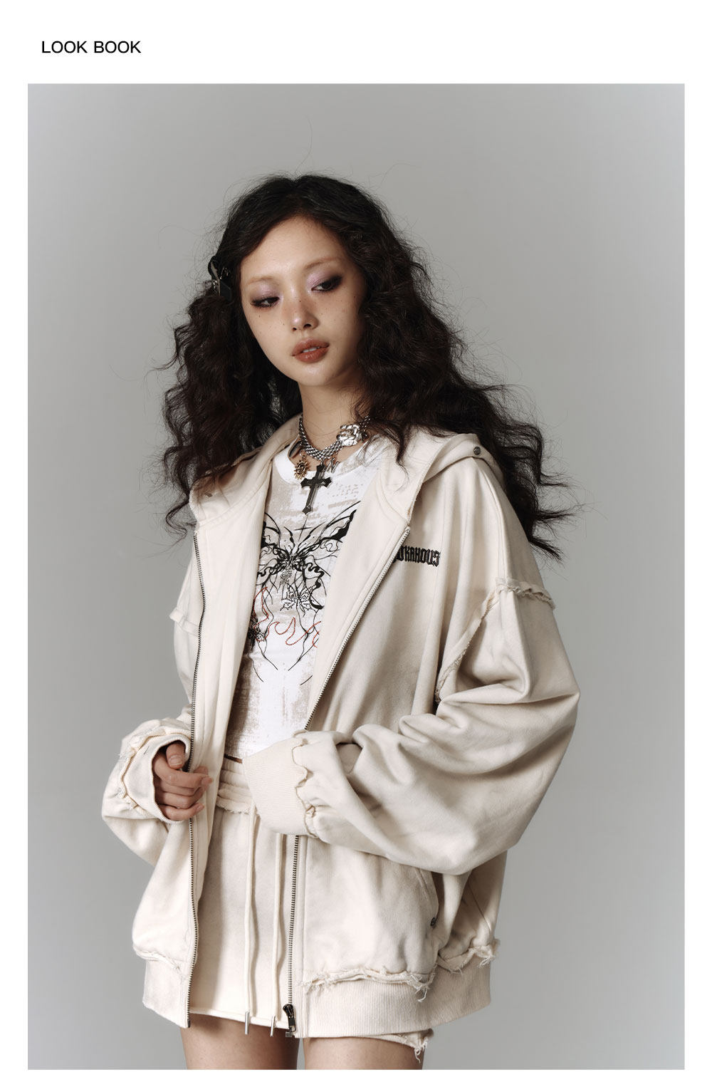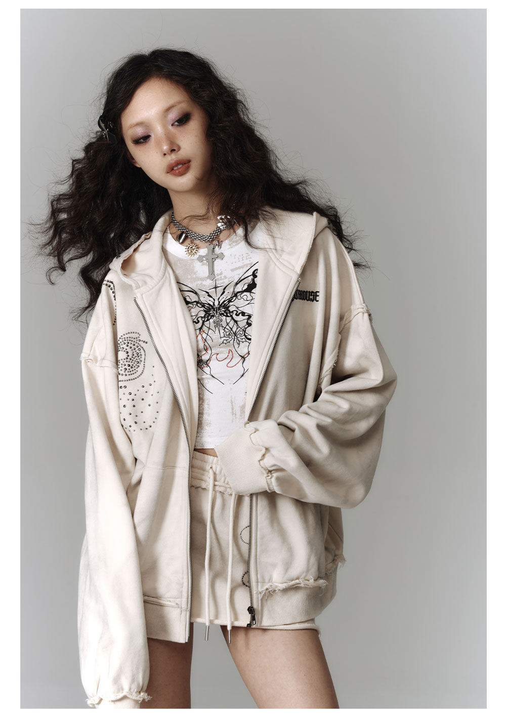 Washed Damage Oversize Zipper Hoodie & Short Skirt & Wide Leg Pants Setup NA8911