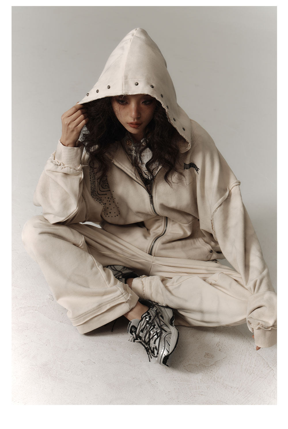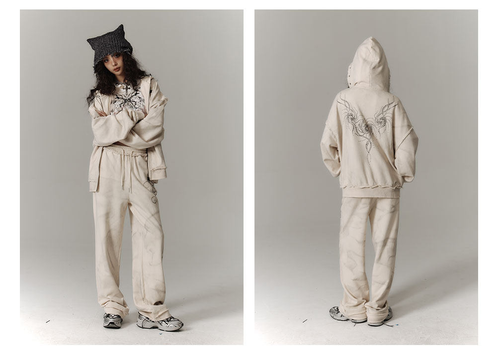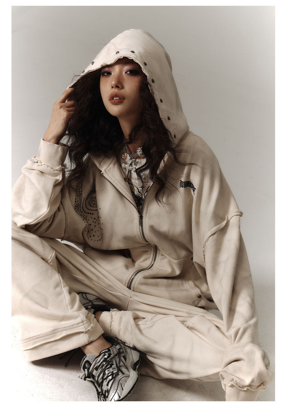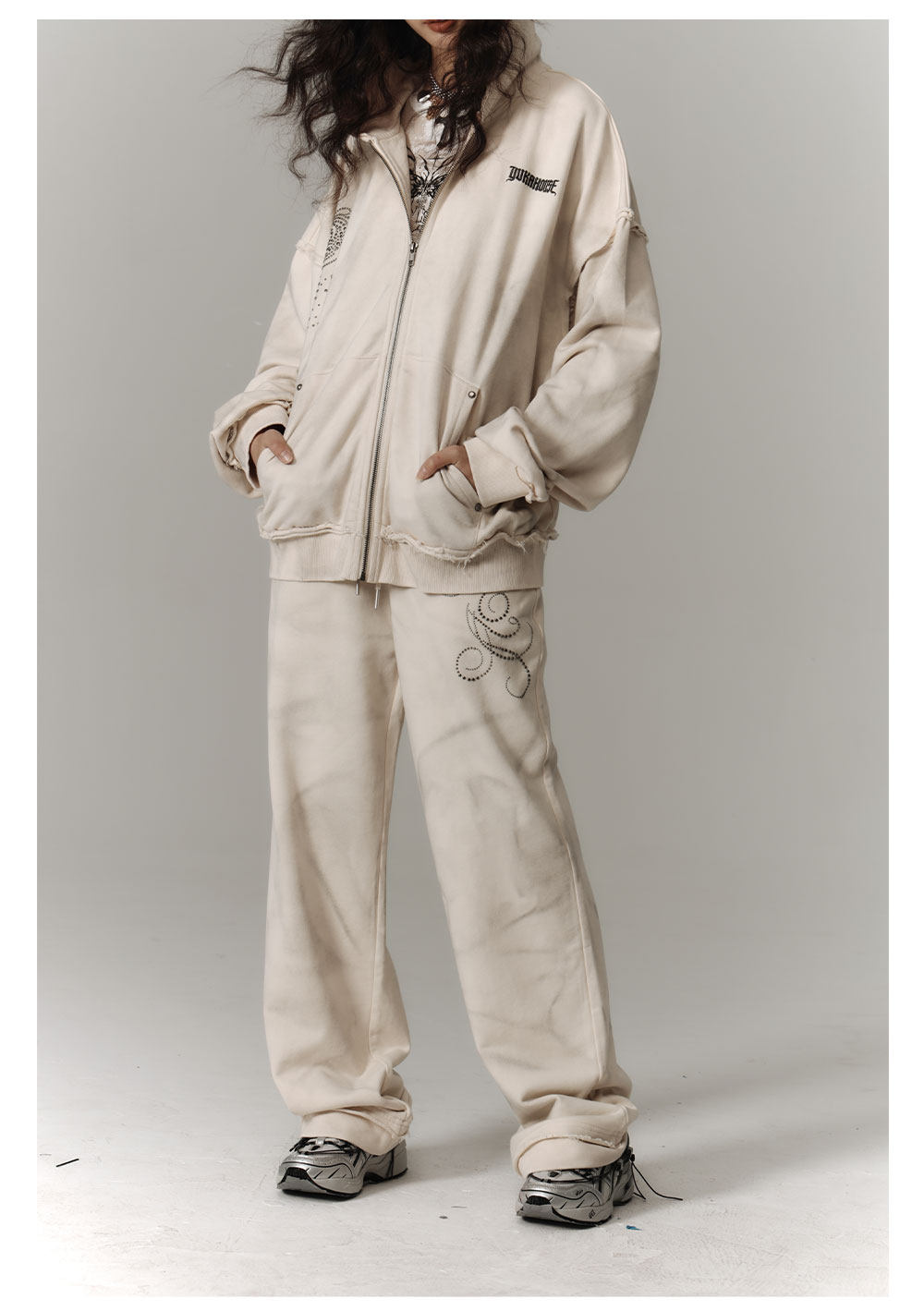 Washed Damage Oversize Zipper Hoodie & Wide Leg Pants Setup NA8913