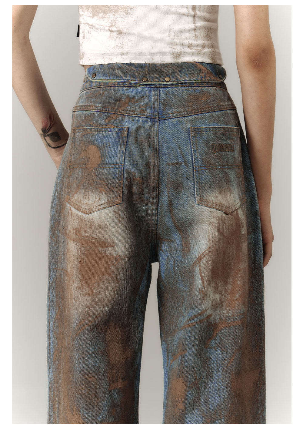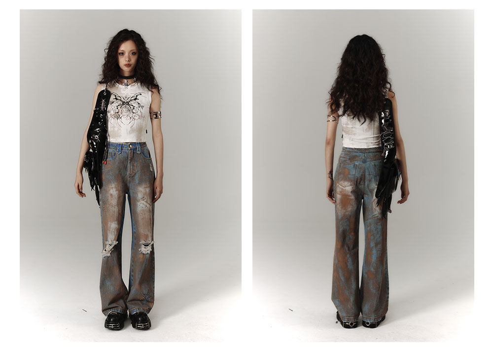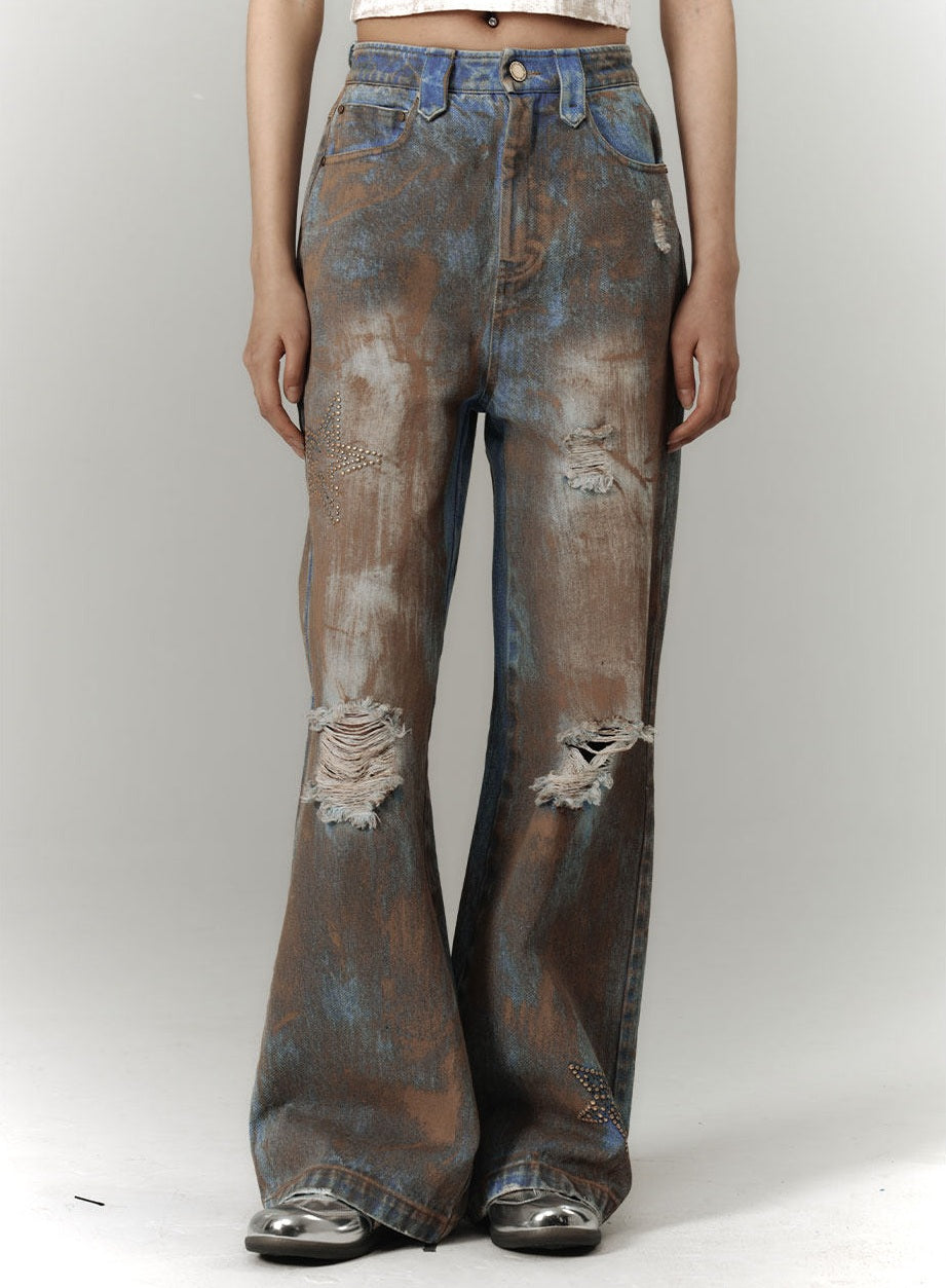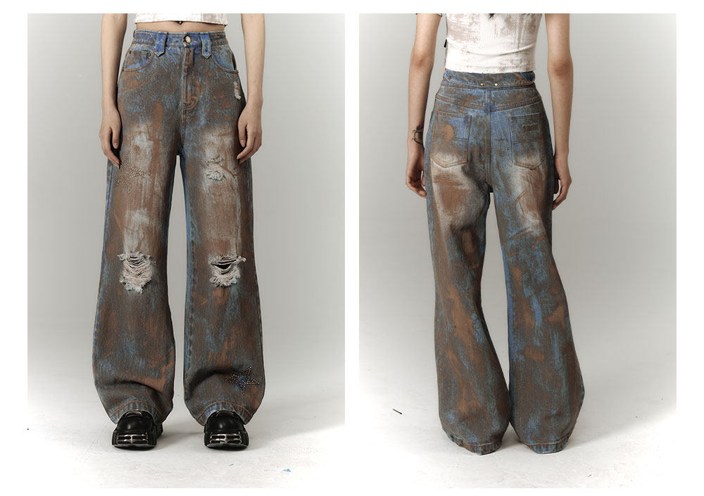 Mud Wash Damage Tie-Dye Wide Leg Straight Denim Jeans NA8928