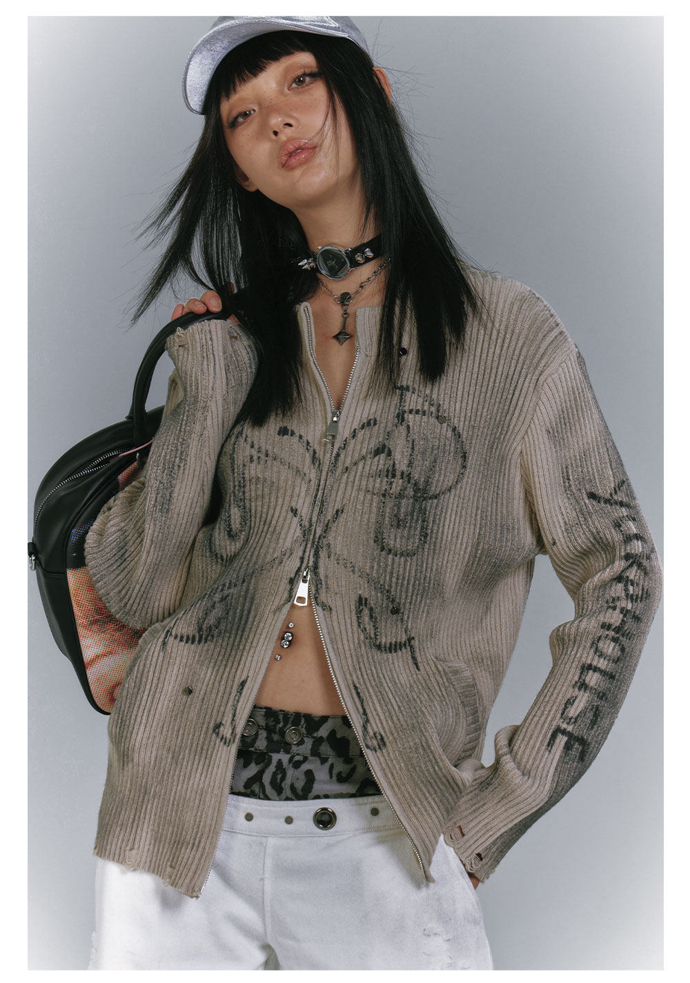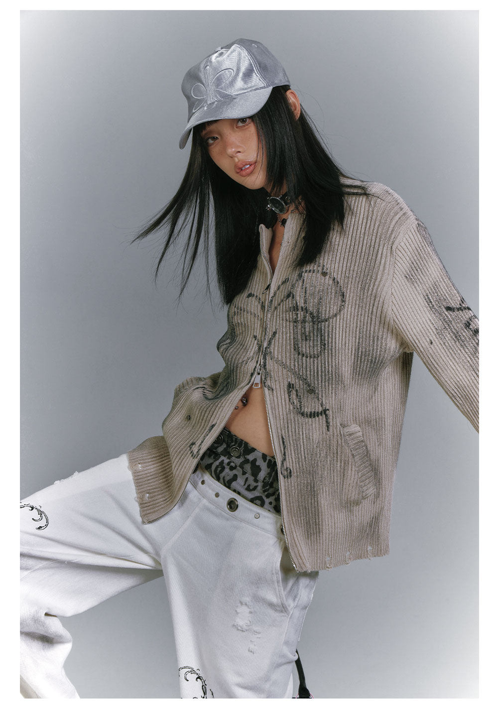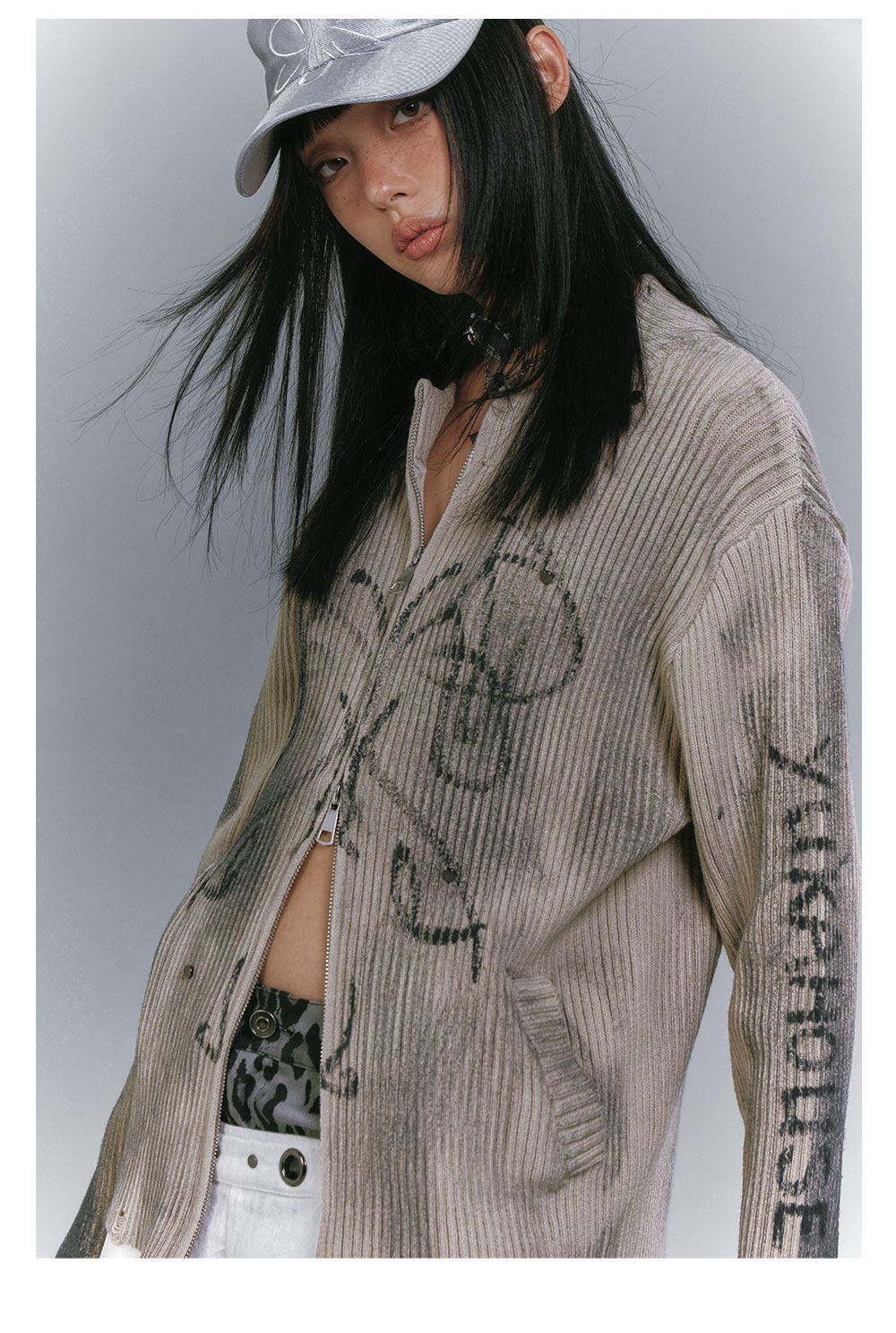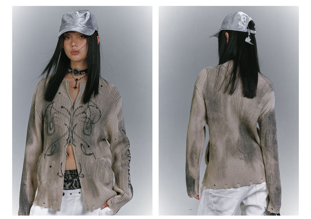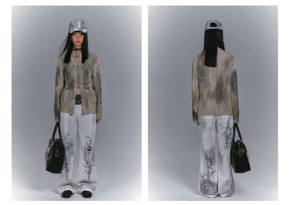 Washed Damage Graffiti Design Oversize Knit Cardigan NA8930