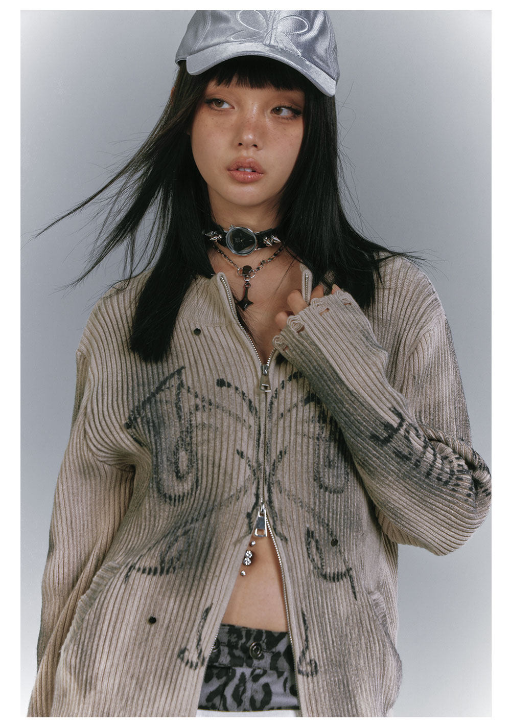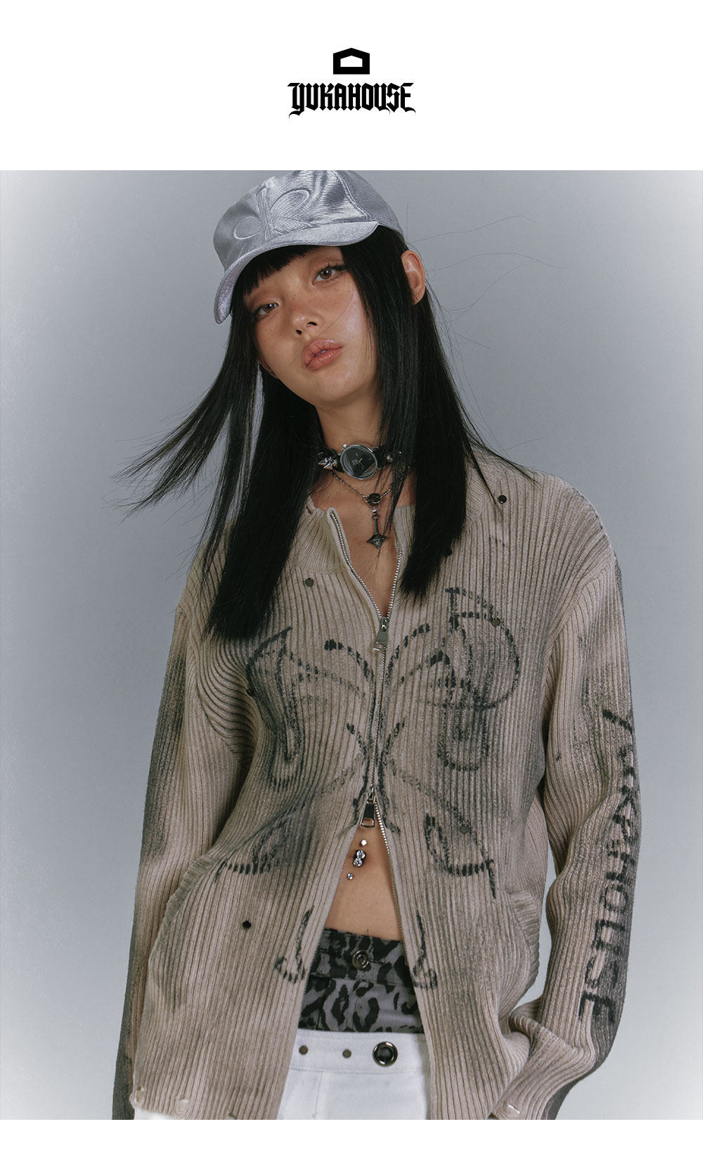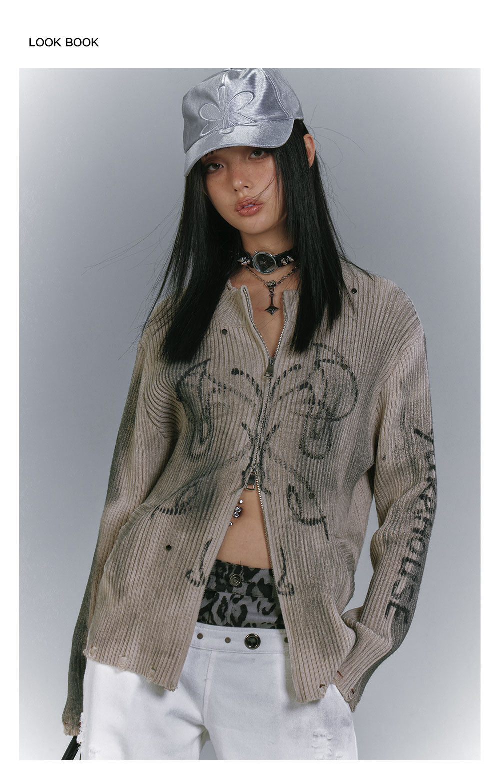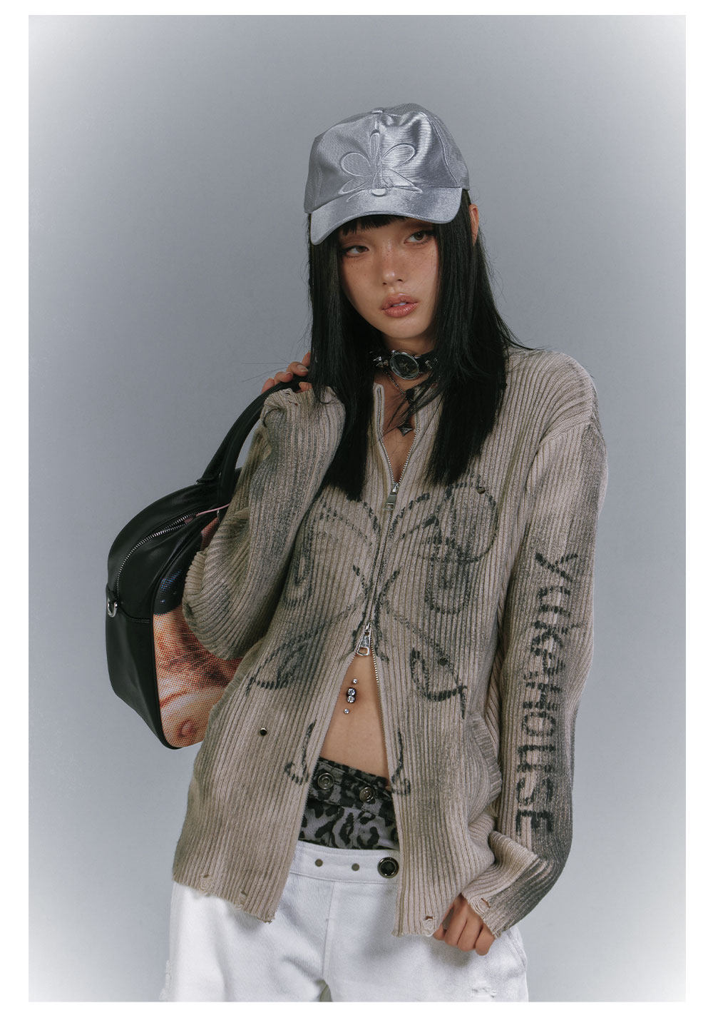 Washed Damage Graffiti Design Oversize Knit Cardigan NA8930