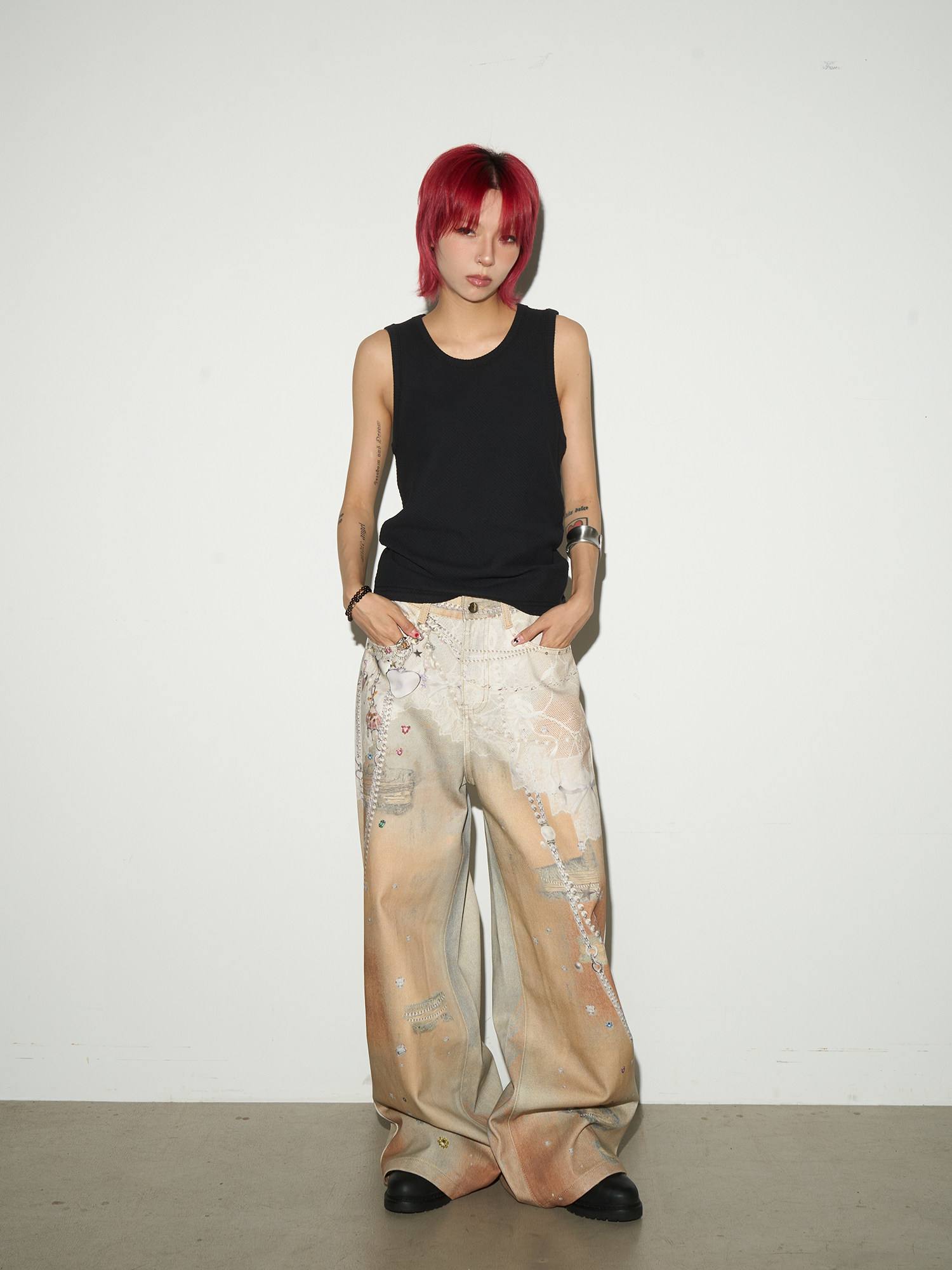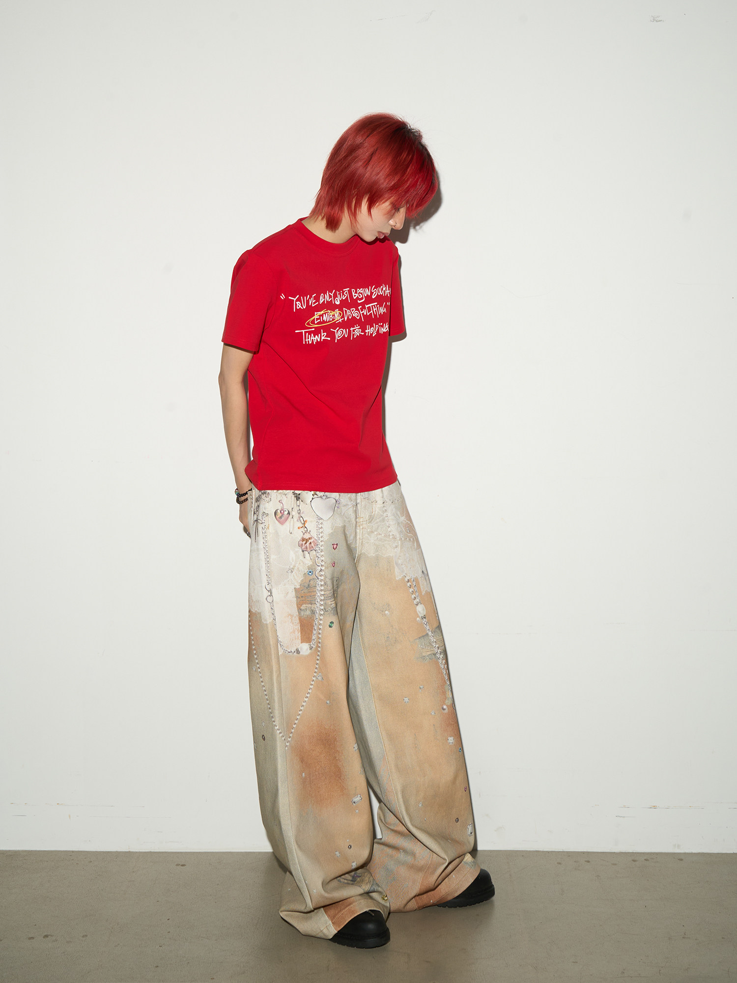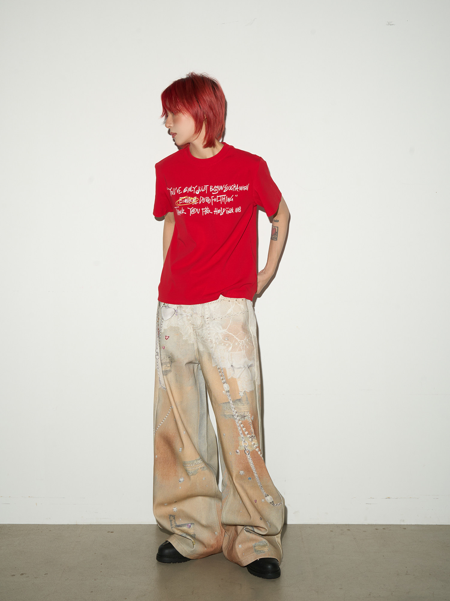 Digital Hand-Drawn Print Wide Leg Denim Jeans NA9112