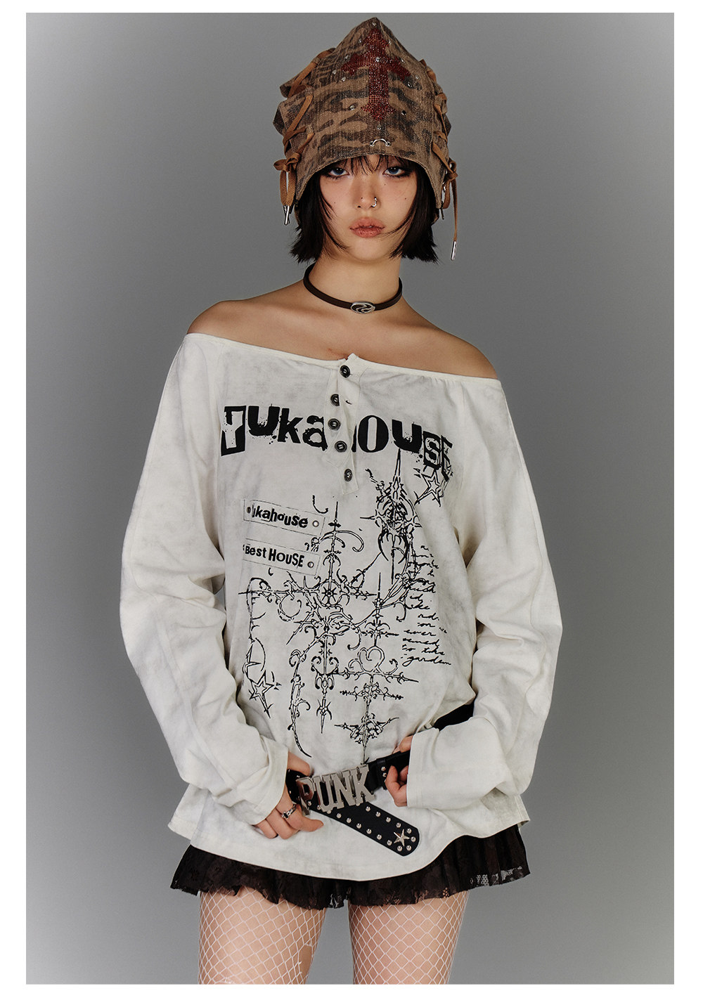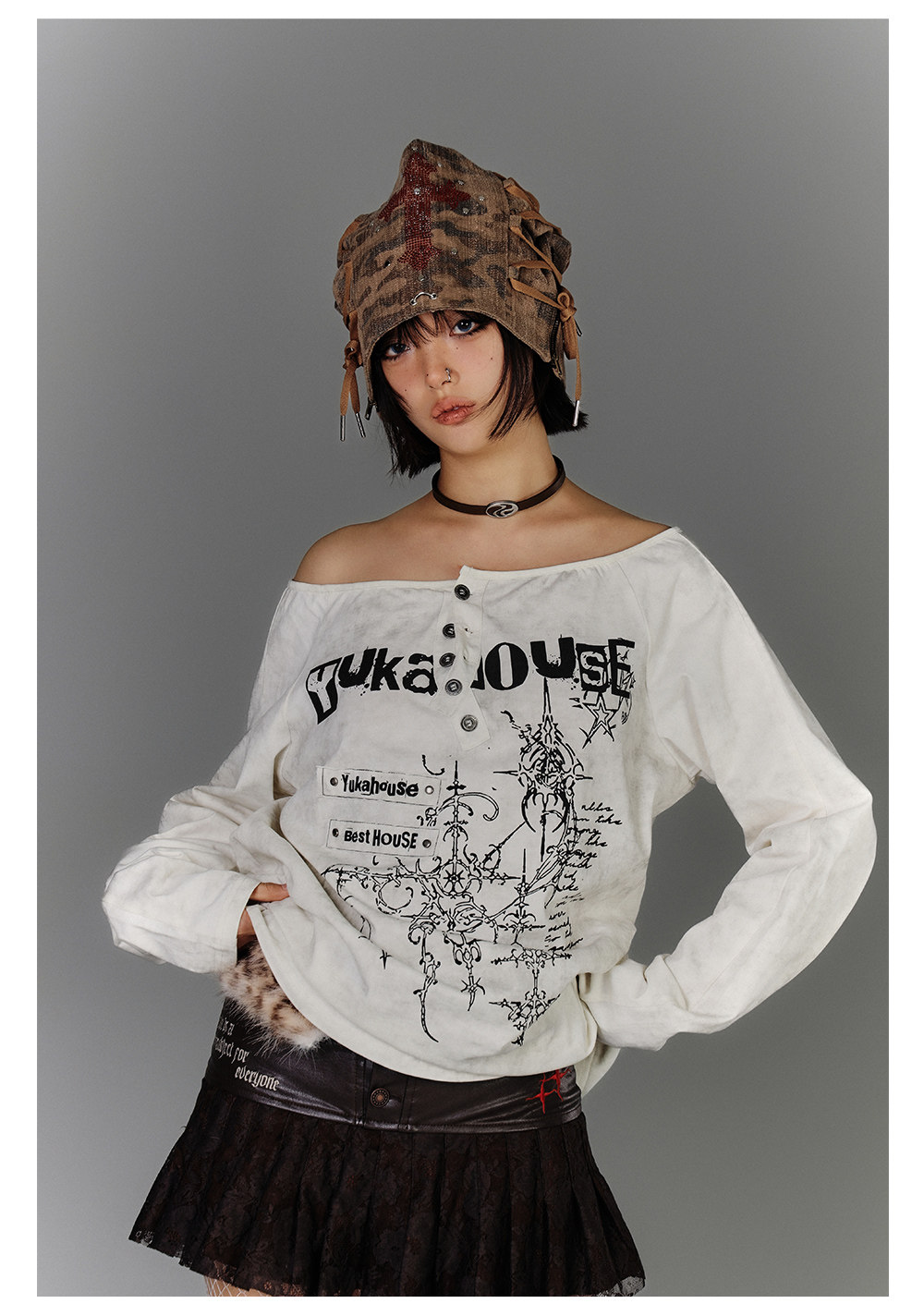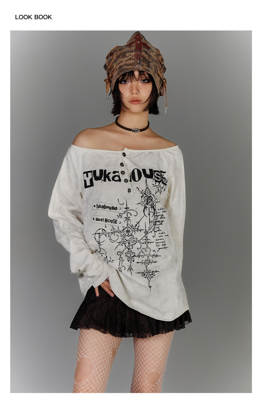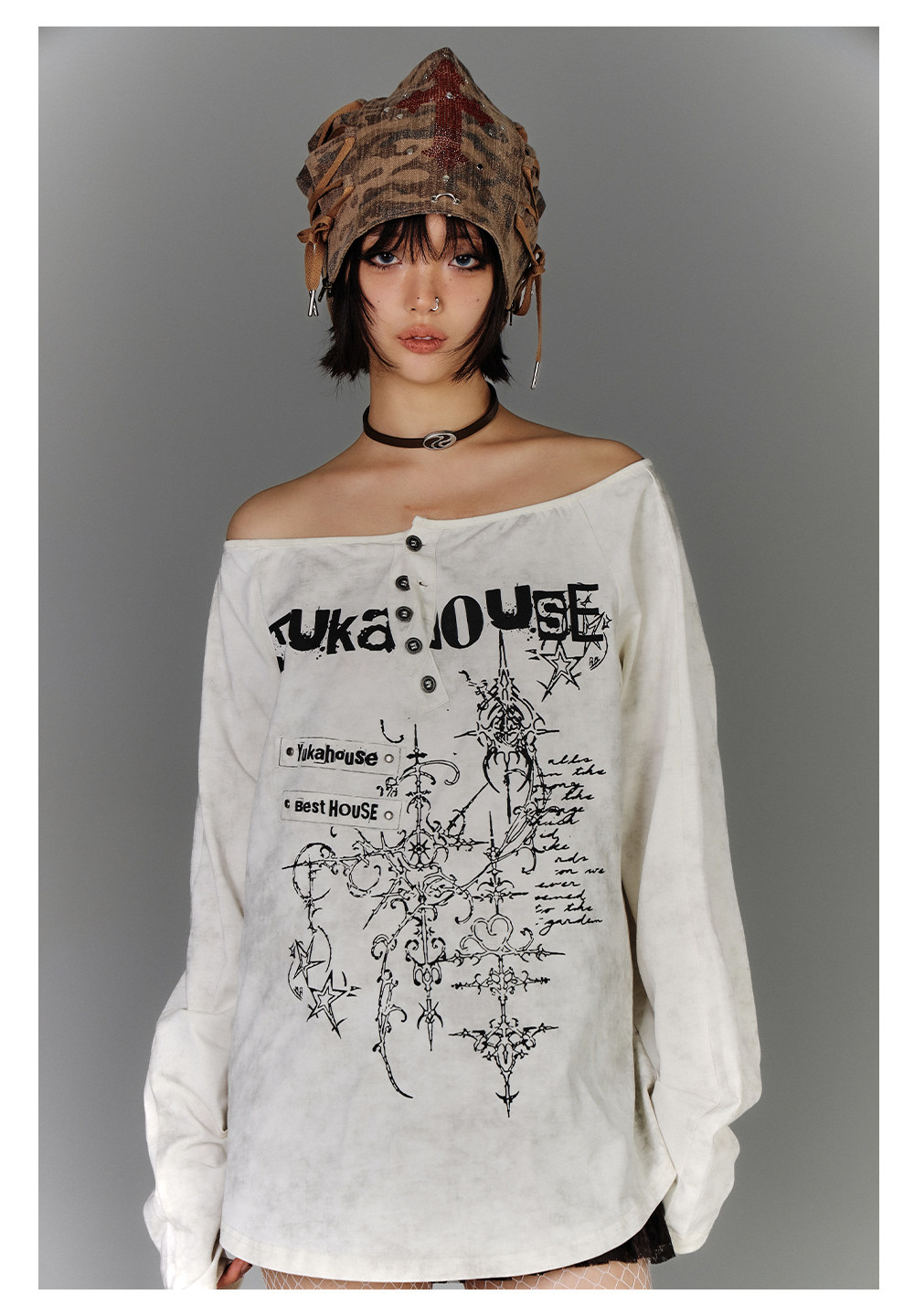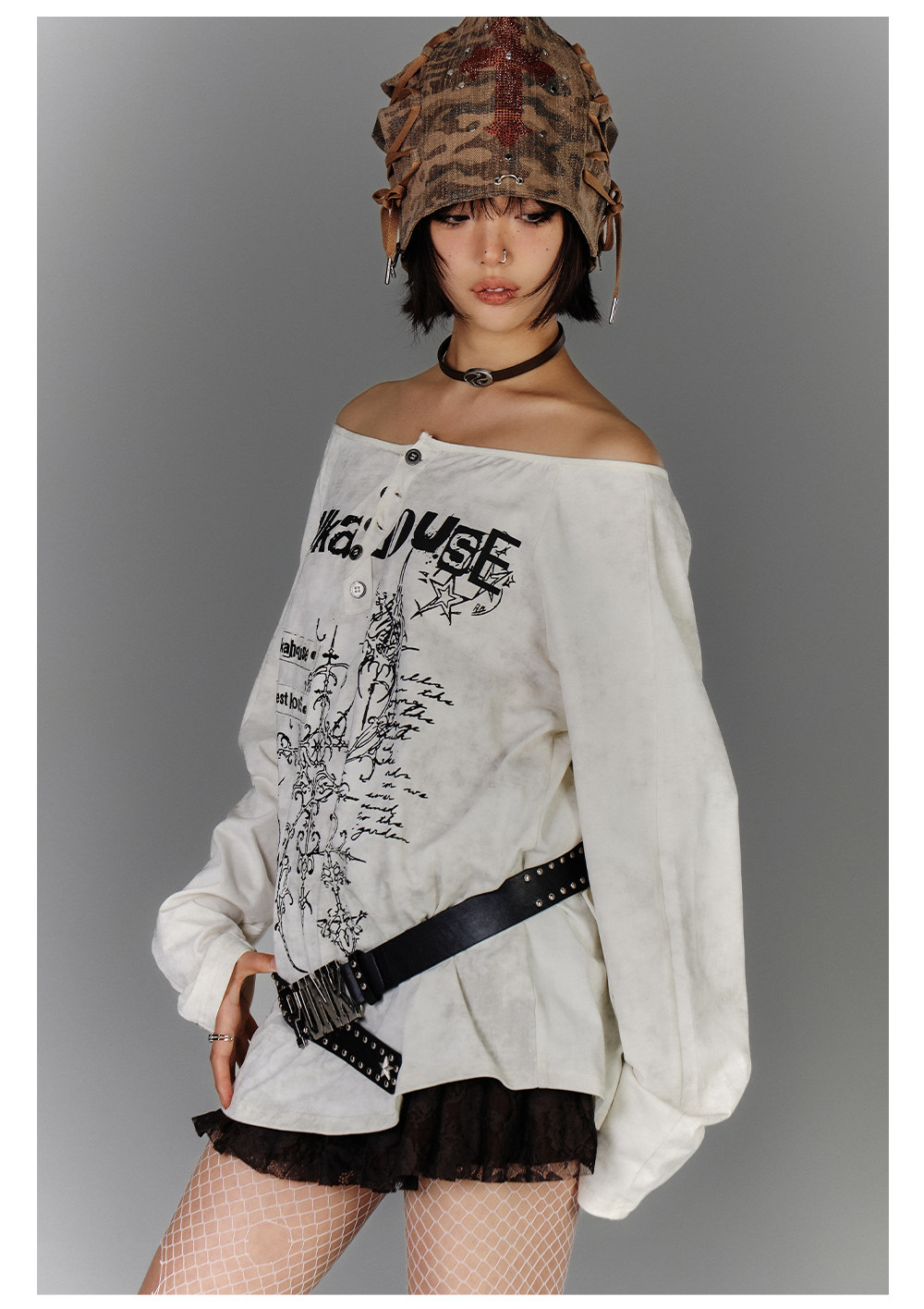 Off-Shoulder Graphic Print Button Long Sleeve T-Shirt NA9226