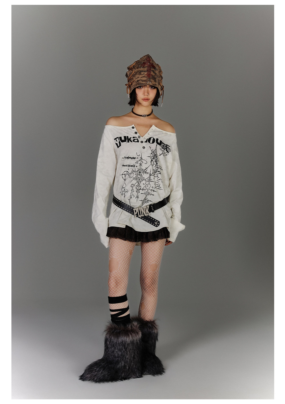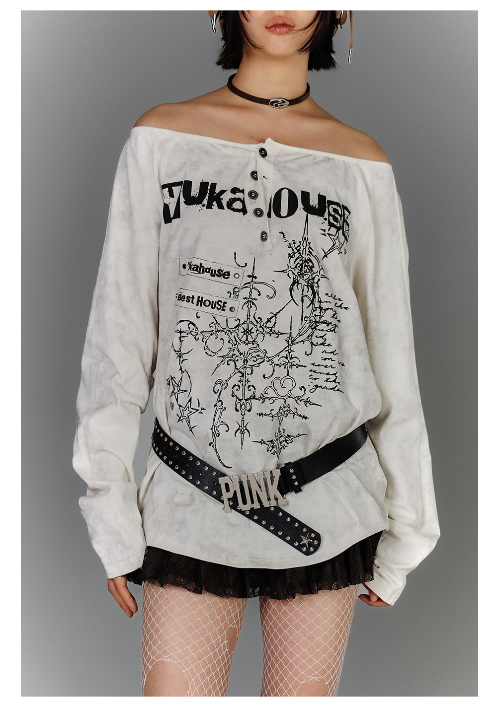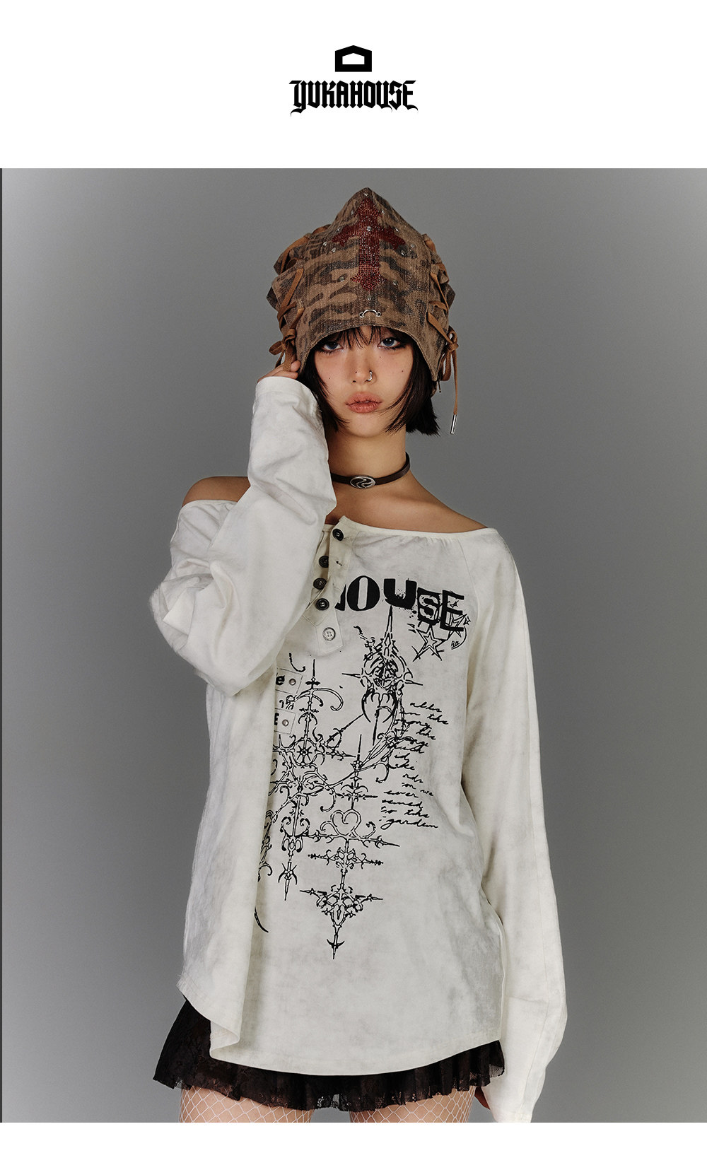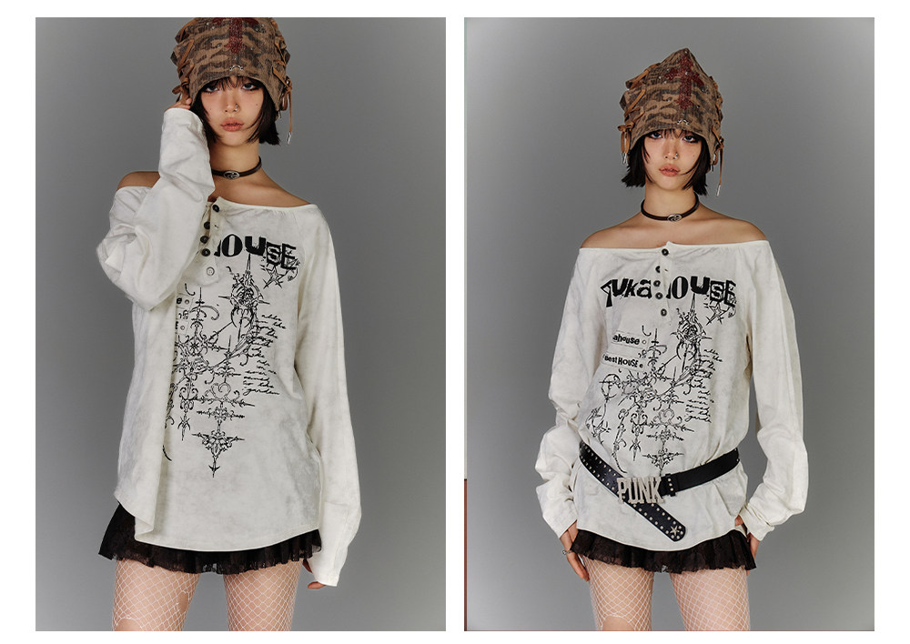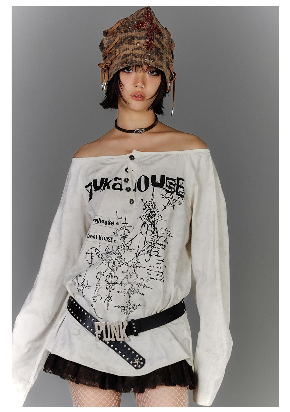 Off-Shoulder Graphic Print Button Long Sleeve T-Shirt NA9226