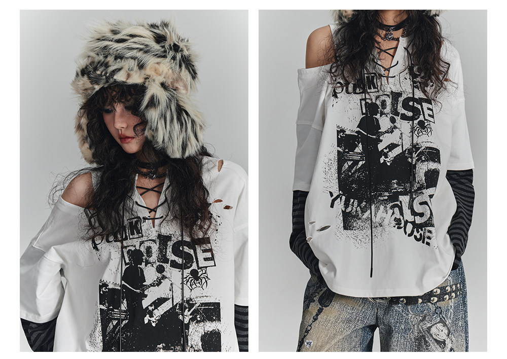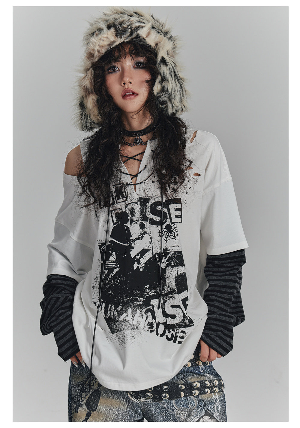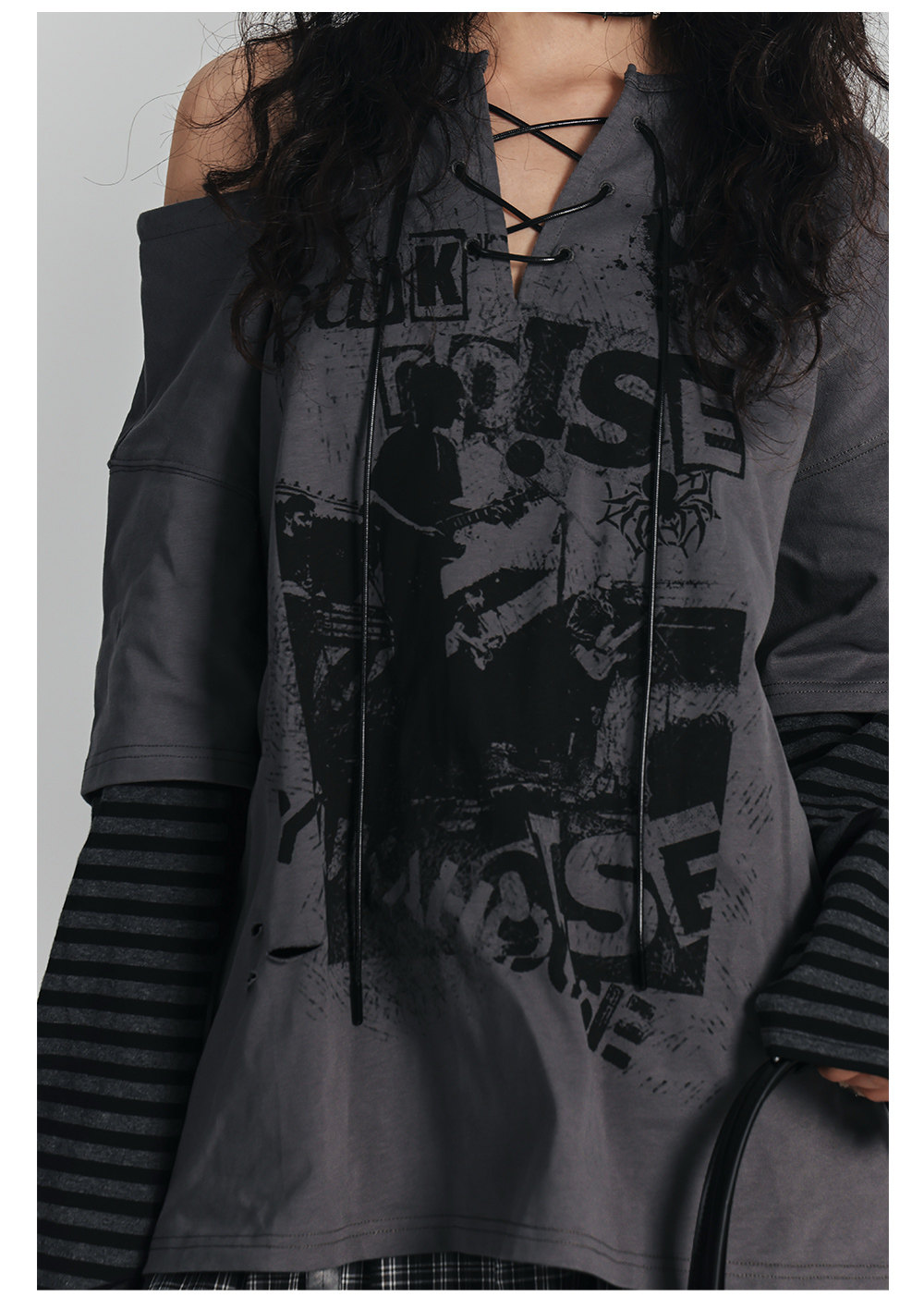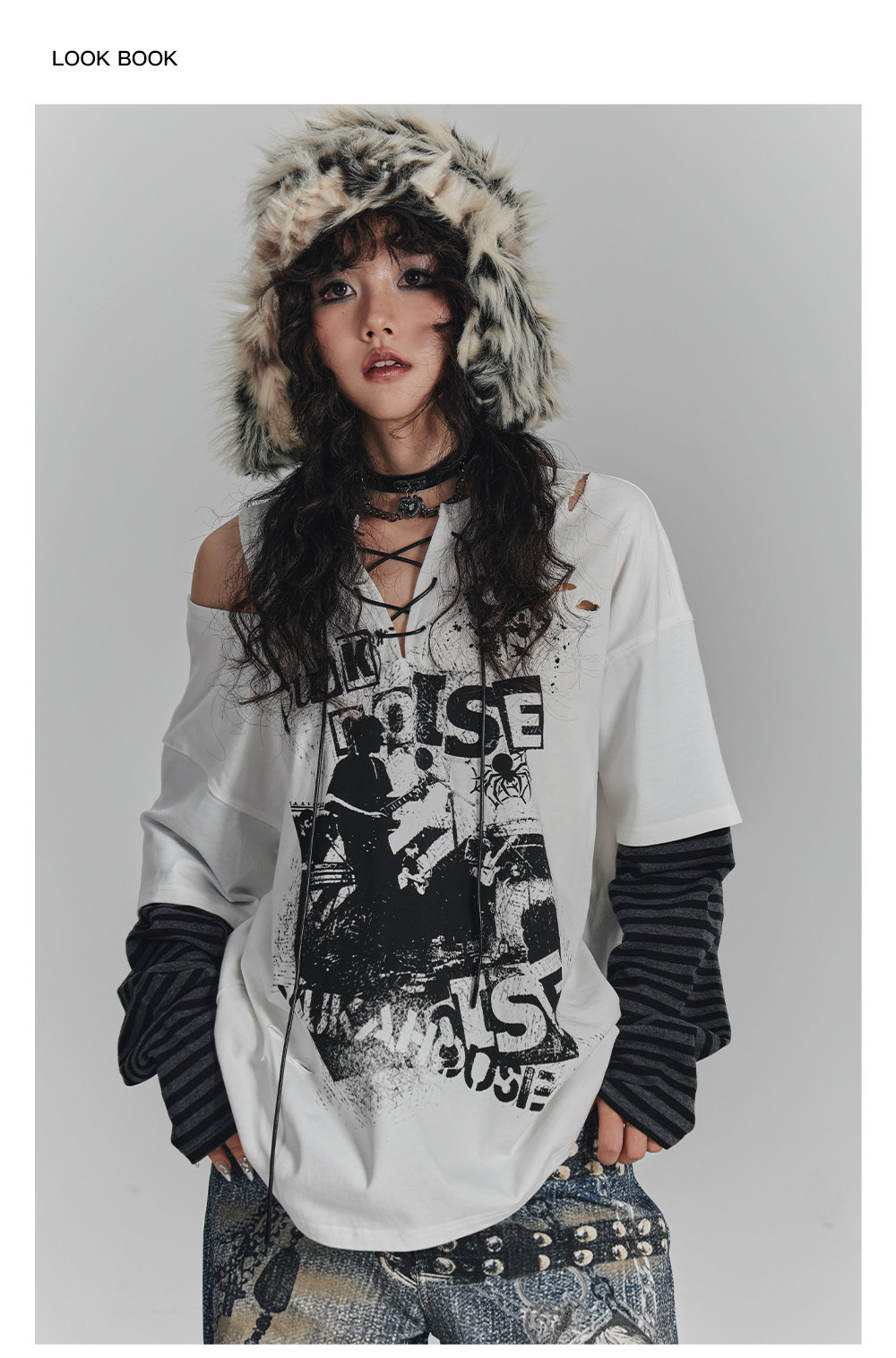 Fake Layered Drawstring V-Neck Long Sleeve T-Shirt NA9235