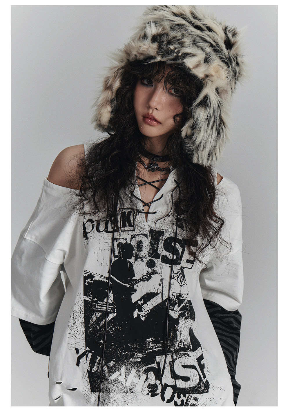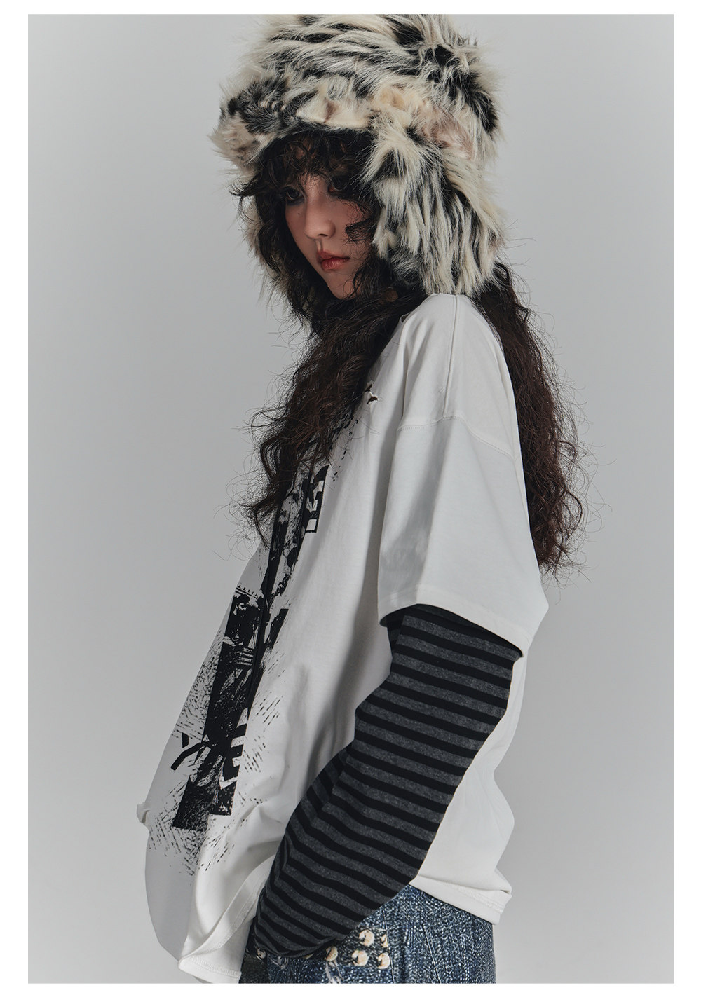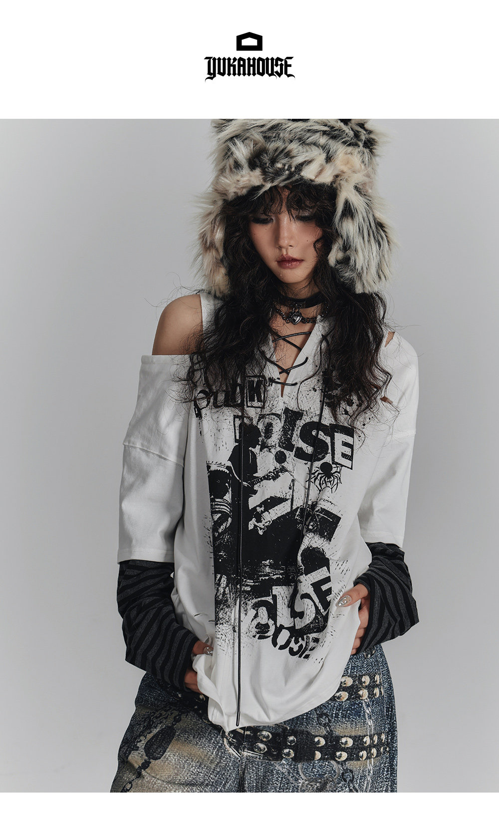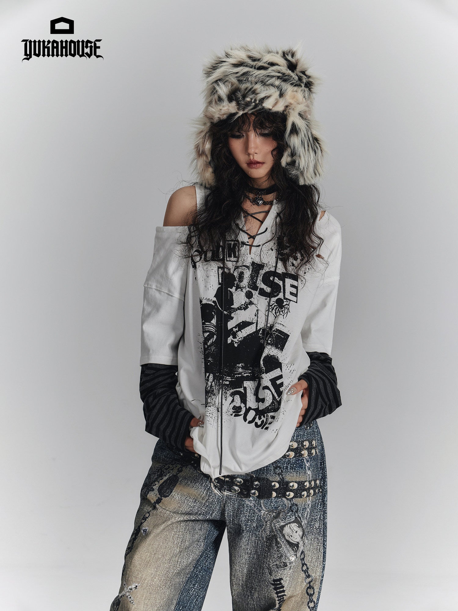 Fake Layered Drawstring V-Neck Long Sleeve T-Shirt NA9235