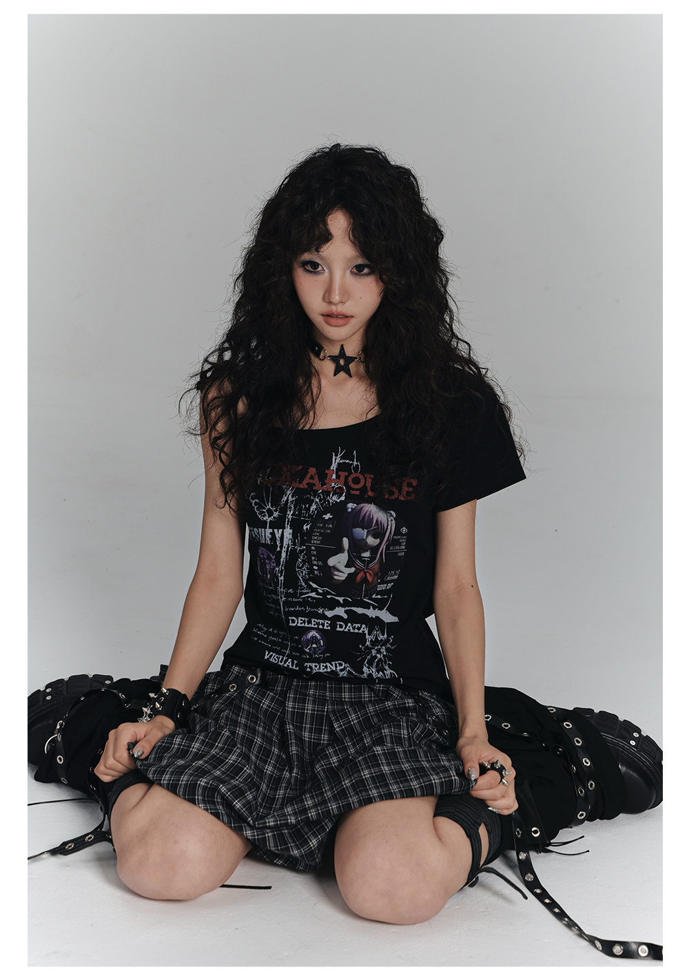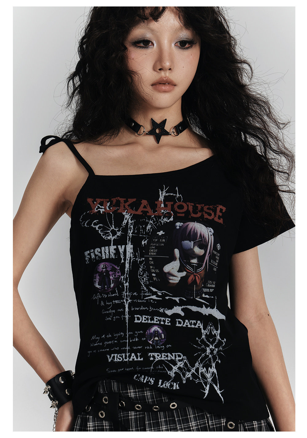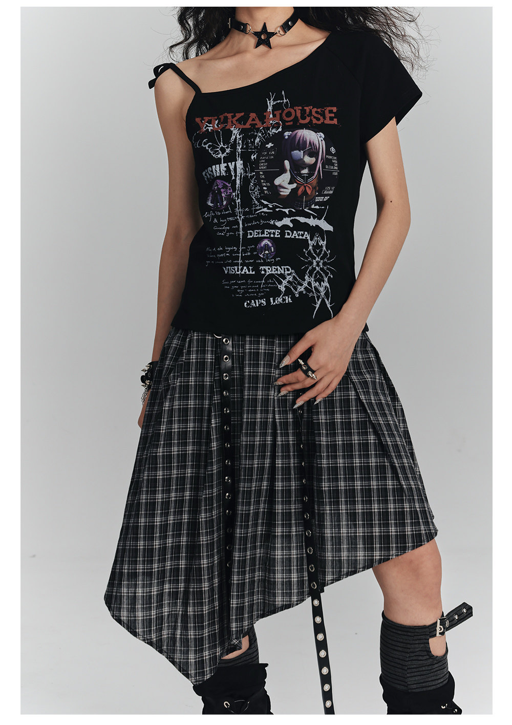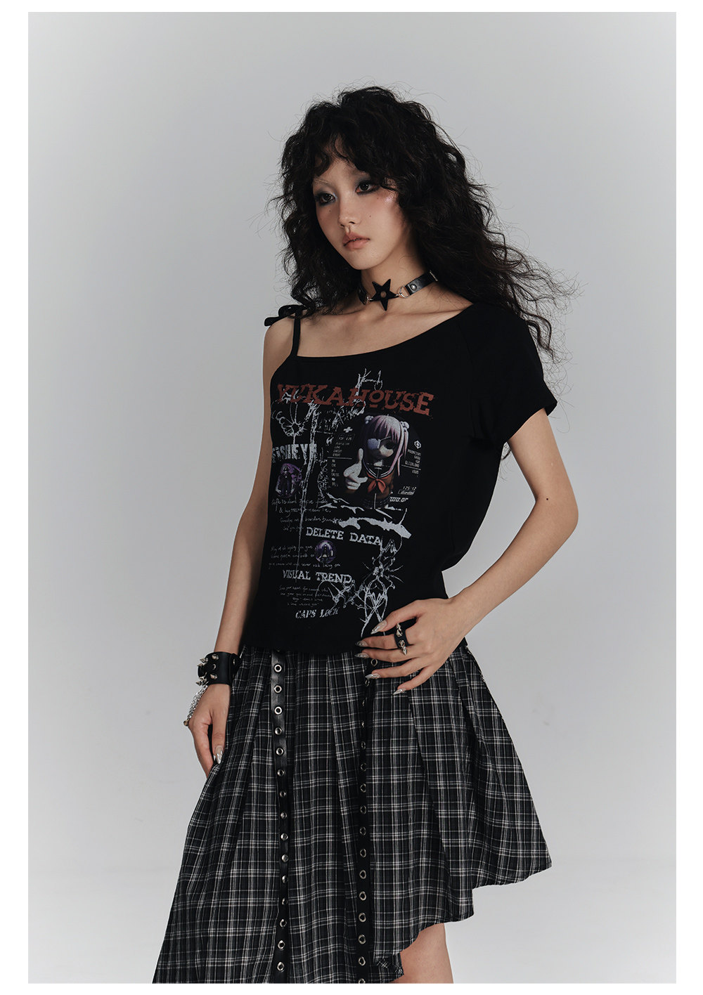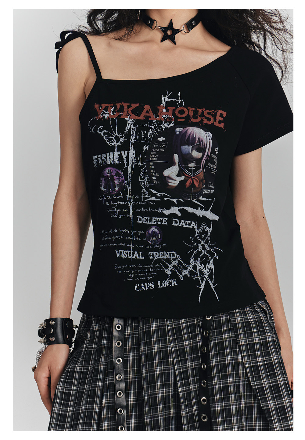 Off-Shoulder Graphic Print Slim Short Sleeve T-Shirt NA9237